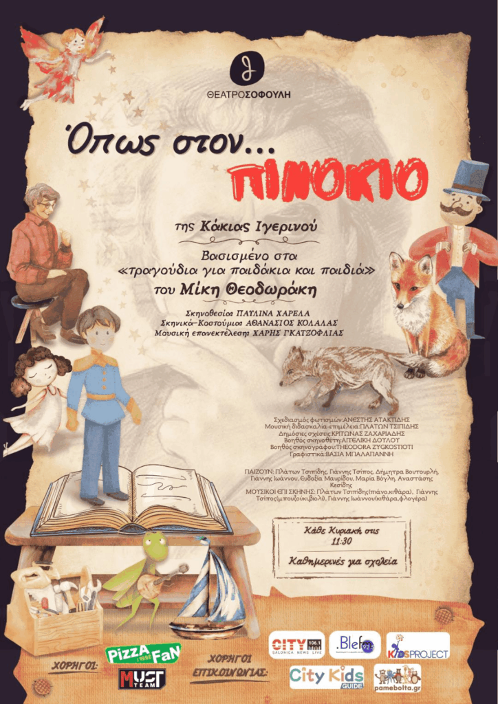 Παίζουν: Πλάτων Τσιπίδης, Γιάννης Τσίπος, Δήμητρα Βουτουρλή, Γιάννης Ιωάννου, Έυδοξία Μαυρίδου, Μαρία Βόγλη, Αναστάσης ΚεσίδηςΜουσικοί επί σκηνής: Πλάτων Τσιπίδης (πιάνο, κιθάρα), Γιάννης Τσίπος (μπουζούκι – βιολί), Γιάννης Ιωάννου (κιθάρα – φλογέρα)ΠληροφορίεςΠρεμιέρα: Κυριακή 05 Όκτωβρίου στις 11.30πμ και κάθε Κυριακή. Γενική Τιμή: 13 ΈυρώΤηλεφωνική προπώληση 12 ΈυρώΤηλέφωνο Πληροφοριών Κρατήσεων: 2310423925Προπώληση:hCps://www.more.com/gr-el/Ockets/theater/children/opos-ston-pinokio/ΘΈΑΤΡΌ ΣΌΦΌΥΛΗ Θέατρο Σοφούλη Τραπεζούντος 5 & Σοφούλη, Τ.Κ. 55131 Θεσσαλονίκη Τηλ. 2310423925, ΠΡΌΣΒΑΣΗ ΌΑΣΘ: Λεωφορείο 5 Από Δυτικάπρος Ανατολικά: ΣτάσηΒερβελίδη (ΘέατροΣοφούλη) Στάση Παλαιότέρμα (Θεατρικό εργαστήρι)Από Ανατολικά προς Δυτικά: Στάση Ναυτικός Όμιλος (Θέατρο Σοφούλη) ΣτάσηΠαλαιό Τέρμα (Θεατρικό εργαστήρι)www.theatrosofouli.grhCps://www.facebook.com/theatrosofoulihCps://www.instagram.com/theatrosofouli/
