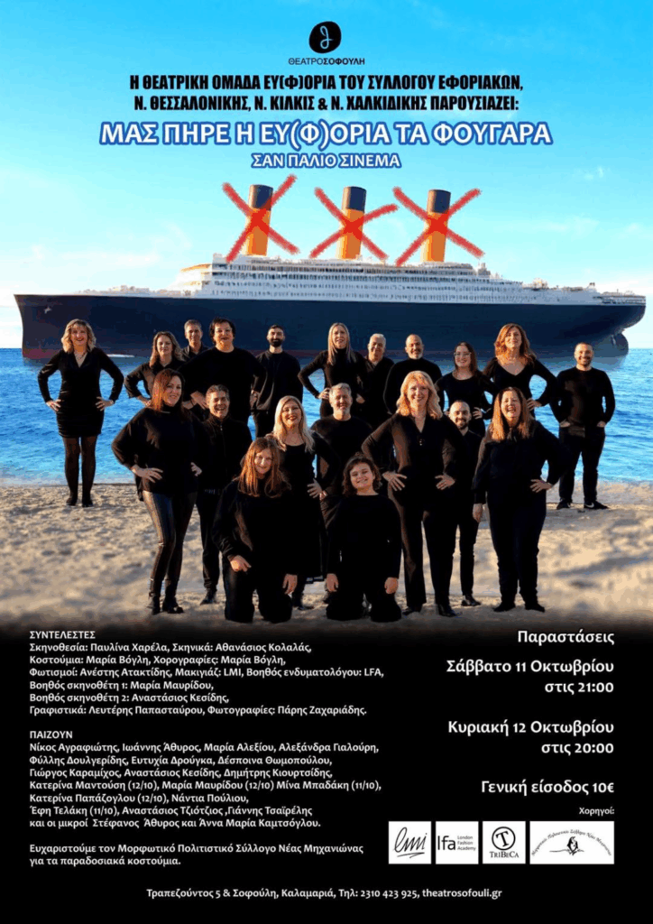 Από: Θέατρο Σο φούλη Τρί 30 Σεπ στις 2:08 μ.μ. ΔΕΛΤΙΟ ΤΥΠΟΥ: ΜΑΣ ΠΗΡΕ Η ΕΥ(Φ)ΟΡΙΑ ΤΑ ΦΟΥΓΑΡΑ Καλησπέρα σας,παρακώρος κοινοποίηση Με εκτίμησηΚρίτωνας Ζαχαριάδης ΔΕΛΤΙΟ ΤΥΠΟΥΟ ΣΥΛΛΟΓΟΣ ΕΦΟΡΙΑΚΏΝ, Ν. ΘΕΣΣΑΛΟΝΙΚΗΣ, Ν. ΚΙΛΚΙΣ ΚΑΙ Ν. ΧΑΛΚΙΔΙΚΗΣΠΑΡΟΥΣΙΑΖΕΙ ΤΗΝ ΠΑΡΑΣΤΑΣΗΜΑΣ ΠΉΡΕ Η ΕΥ(Φ)ΟΡΊΑ ΤΑ ΦΟΥΓΆΡΑ-ΣΑΝ ΠΑΛΙΟ ΣΙΝΕΜΑΣάββατο 11 Οκτωβρίου 21:00 καιΚυριακή 12 Οκτωβρίου 20:00Η θεατρική ομάδα Ευ(φ)ορία του πολιτιστικού τμήματος του Συλλόγου εφοριακών, Ν.Θεσσαλονίκης,Ν.ΚιλκίςκαιΝ.Χαλκιδικήςμετάτηνπερσινήεπιτυχία τηςπαράστασηςπαρουσιάζει και φέτος την κωμωδία «Μας πήρε η Ευ(φ)ορία τα φουγάρα-Σαν παλιό σινεμά»στοΘέατροΣοφούληγια2μόνοπαραστάσεις.Σάββατο 11 Οκτωβρίου στις21.00 και Κυριακή 12 Οκτωβρίου στις 20.00Ηθεατρικήομάδα Ευ(φ)ορία συνεργάζεται μετο ΘέατροΣοφούληεδώ και14 χρόνιακαικάθε χρόνο η παράστασή της αποτελεί μια νέα έκπληξη. Λίγα λόγια για το έργοΜια μιούζικαλ κωμωδία καταστάσεων η οποία παρωδεί τον παλιό ελληνικό κινηματογράφο, τα δράματα τα μελό, τις κωμωδίες, τα μιούζικαλ του Δαλιανίδη καθώς και τις ιστορικές ηθογραφικές ταινίες από το ‘60 και μετά, ιδωμένα με μια πιο σύγχρονη ματιά. Δύο κλασσικές στερεοτυπικές οικογένειες εμπλέκονται , περιπλέκονται και διαπλέκονται σε καταστάσεις ευτράπελων γεγονότων όπου με δολοπλοκίες ίντριγκες και παράνομους έρωτες συνυπάρχουν και επιβιώνουν, δίχως να γνωρίζουν ότι η μοίρα τους επιφυλάσσει λογιών απρόοπτα τα οποία φέρνουν τις ανατροπές έπειτα της αποκάλυψης ενός κοινού μυστικού πουφέρνει κοντά τα μέλη των οικογενειών όπου στο τέλος όπως σε όλες της ελληνικές οικογένειες καταλήγουν με έναν γάμο!