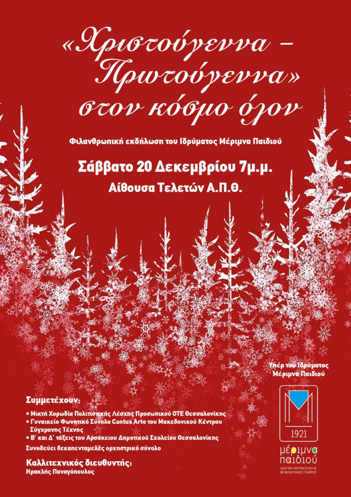 - φιλανθρωπική εκδήλωση του Ιδρύματος Μέριμνα Παιδιού: «Χριστούγεννα-Πρωτούγεννα» στον κόσμο όλον, που θα πραγματοποιηθεί το Σάββατο 20 Δεκεμβρίου 2025, στις 7 το απόγευμα, στην Αίθουσα Τελετών του Αριστοτελείου Πανεπιστημίου Θεσσαλονίκης (Α.Π.Θ.)ΔΕΛΤΙΟ ΤΥΠΟΥ