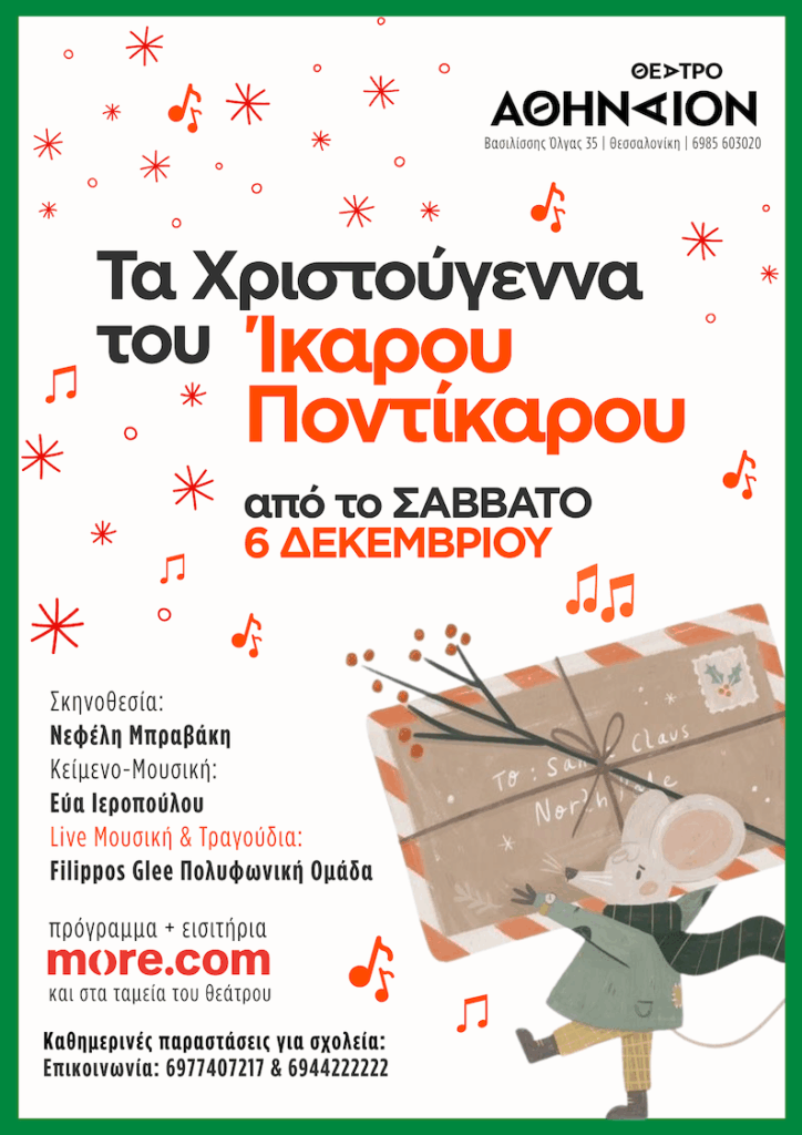 το πώς, αν ενωθούμε, μπορούμε να αλλάξουμε τον κόσμο, ακόμα κι αν είμαστε ένα μικρό ποντίκι!ΣυντελεστέςΣκηνοθεσία: Νεφέλη ΜπραβάκηΚείμενα & Μουσική: Εύα ΙεροπούλουΕνορχήστρωση: Νίκη ΜπραβάκηΧορογραφίες: Μελίνα ΓιοβανούδηΚοστούμια: Σόνια Μαρία ΚαϊτατζήΜάσκες: Ειρήνη ΑγιαννίτηΠαίζουν μουσική, τραγουδούν και πρωταγωνιστούν οι:Φιλαρέτη Πεντούση, Χάρης Αραμπατζής, Μυρτώ Σταυρακίδου,Οδυσσέας Αλεξανδρίδης, Νικολέτα Τζιώκου, Στέφανος Γαζίλας, Νίκος ΤζαφόςΠαραγωγή: Θέατρο ΑθήναιονΤα Χριστούγεννα του Ίκαρου Ποντίκαρου 1Τα Χριστούγεννα του Ίκαρου Ποντίκαρου 2ΠΟΥ ΚΑΙ ΠΟΤΕΘέατρο Αθήναιον, Λ. Βασιλίσσης Όλγας 35, ΘεσσαλονίκηΤηλέφωνο: 6985 60 30 20Παραστάσεις: από 3 Δεκεμβρίου 2025 καθημερινές παραστάσεις για σχολεία και από 6 Δεκεμβρίου 2025 – 6 Ιανουαρίου 2026 για το κοινόΠρόγραμμα παραστάσεων:Σάββατο 6 Δεκεμβρίου 2025, 17:00Κυριακή 7 Δεκεμβρίου 2025, 11:00Σάββατο 13 Δεκεμβρίου 2025, 17:00Κυριακή 14 Δεκεμβρίου 2025, 11:00Κυριακή 21 Δεκεμβρίου 2025, 11:00Παρασκευή 26 Δεκεμβρίου 2025, 11:00Σάββατο 27 Δεκεμβρίου 2025, 17:00Κυριακή 28 Δεκεμβρίου 2025, 11:00Παρασκευή 2 Ιανουαρίου 2026, 11:30Κυριακή 4 Ιανουαρίου 2026, 11:30