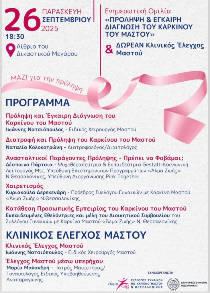 Ο ΔΣΘ διοργανώνει με το ΑΛΜΑ ΖΩΗΣ Ν.Θεσσαλονίκης την ΠΑΡΑΣΚΕΥΗ 26.9.25 και ώρα 6:30μμ στο αίθριο του Δικαστικού Μεγάρου Θεσσαλονίκης εκδήλωση με θέμα «Πρόληψη & έγκαιρη διάγνωση του καρκίνου του μαστού». Ο ΔΣΘ αποδεικνύει για ακόμη μια φορά την ευαισθησία του σε ζητήματα που αφορούν στην υγεία και πρόληψη νοσημάτων όπως αυτού του καρκίνου του μαστού. Είναι κρίσιμο να λαμβάνει κανείς την πληροφορία όταν ίσως δεν την χρειάζεται κατά προτεραιότητα, ώστε να είναι σε θέση να τη μεταδώσει όταν καταστεί ανάγκη. Η εκδήλωση περιλαμβάνει τις ομιλίες του ειδικού χειρουργού μαστού κ Ιωάννη Νατσιόπουλου ,της διατροφολόγου/διαιτολόγου κας Ναταλίας Κολοκοτρώνη και της ψυχοθεραπεύτριας/ υπεύθυνης επιστημονικών προγραμμάτων του Συλλόγου Άλμα Ζωής Ν.Θεσσαλονίκης κας Δέσποινας Πάρτσια ενώ χαιρετισμό θα απευθύνει η κα Κυριακούλα Δερεκενάρη ,πρόεδρος του Συλλόγου Άλμα Ζωής Ν.Θεσσαλονίκης. Ακολουθεί η παρουσίαση προσωπικών εμπειριών γυναικών του Συλλόγου ενώ η εκδήλωση θα κλείσει με κλινικό έλεγχο μαστού από τον κ Νατσιόπουλο και έλεγχο μαστού μέσω υπερήχου από την κ Μαλανδρή-Ιατρό Μαιευτήρα/Γυναικολόγο Ειδικό Υποβοηθούμενης Αναπαραγωγής στον χώρο του ιατρείου του ΔΣΘ στο ισόγειο του Δικαστικού Μεγάρου.(*Συνημμένο το πρόγραμμα της εκδήλωσης)