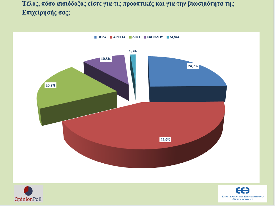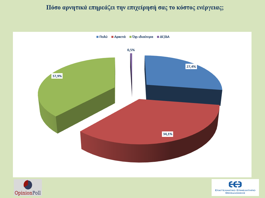 ουδέτερη. Στις Ατομικές Επιχειρήσεις είναι αρκετά πιο ενισχυμένη η άποψη για αρνητική επίδραση σε ποσοστό 46,5%, ενώ ουδέτερη ήταν η επίδραση για το 43.6%. – Ωστόσο γενικότερα, η συντριπτική πλειοψηφία της τάξης του 84% ( άθροισμα ΝΑΙ και μάλλον ΝΑΙ) πιστεύει, ότι χρειάζεται κατάργηση του τεκμαρτού τρόπου φορολόγησης και αντικατάστασή του από ένα αναλογικότερο και πιο δίκαιο σύστημα. – Τεράστιο ποσοστό της τάξης του 92.7% ( ΝΑΙ και μάλλον ΝΑΙ) θεωρεί, ότι η αύξηση του μισθολογικού κόστους που υπήρξε, χρειάζεται να συνοδευτεί με την άμεση μείωση των ασφαλιστικών εισφορών και των φορολογικών επιβαρύνσεων. Αντίθετη άποψη έχει μόλις το 5.9%.- Η πλειοψηφία των Επιχειρήσεων επηρεάζεται σημαντικά από το ενεργειακό κόστος. Πιο συγκεκριμένα, πολύ και αρκετά επηρεάζεται αρνητικά το 61.5% , ενώ όχι ιδιαίτερα δηλώνει το 37.9%. – Υπάρχει απαισιοδοξία ως προς την βιωσιμότητα Επιχειρήσεων από περίπου έναν στους τρεις . Το 20.8% δηλώνει λίγο και το 10.3% καθόλου αισιόδοξο για τις προοπτικές και την βιωσιμότητα της Επιχείρησής του. Το 24.7% δηλώνει πολύ αισιόδοξο και το 42.9% αρκετά. «Αμεση ανάγκη για ριζικές αλλαγές»«Τα αποτελέσματα της έρευνας που διεξήγαγε το Επαγγελματικό Επιμελητήριο Θεσσαλονίκης είναι αποκαλυπτικά και επιβεβαιώνουν πλήρως τις θέσεις που έχουμε διατυπώσει εδώ και καιρό. Οι μικρομεσαίες επιχειρήσεις του νομού μας βρίσκονται σε εξαιρετικά δύσκολη θέση. Είναι ιδιαίτερα ανησυχητικό ότι μία στις τρεις επιχειρήσεις δηλώνει απαισιόδοξη για τη βιωσιμότητά της. Αυτό υπογραμμίζειτην άμεση ανάγκη για ριζικές αλλαγές. Τα ευρήματα της έρευνας δεν είναι απλώς στατιστικά στοιχεία, αλλά η ζωντανή αποτύπωση της εικόνας της αγωνίας χιλιάδων επαγγελματιών. Ως Επαγγελματικό Επιμελητήριο Θεσσαλονίκης, καλούμε την Πολιτεία να τα λάβει σοβαρά υπόψη της και να προχωρήσει άμεσα σε ουσιαστικές παρεμβάσεις. Οχι ως χάρη, αλλά ως ανταπόδοση για την υπευθυνότητα και την υπερπροσπάθεια των μικρομεσαίων και των ελευθέρων επαγγελματιών, για όσα προσέφεραν στις διαδοχικές κρίσεις της τελευταίας 15ετίας. Δεν υπάρχει χρόνος για χάσιμο. Η βιωσιμότητα των μικρομεσαίων επιχειρήσεων είναι συνυφασμένη με την οικονομική ανάπτυξη της χώρας και την ευημερία της κοινωνίας μας» αναφέρει σε δήλωσή του ο πρόεδρος του ΕΕΘ, Κυριάκος Μερελής.