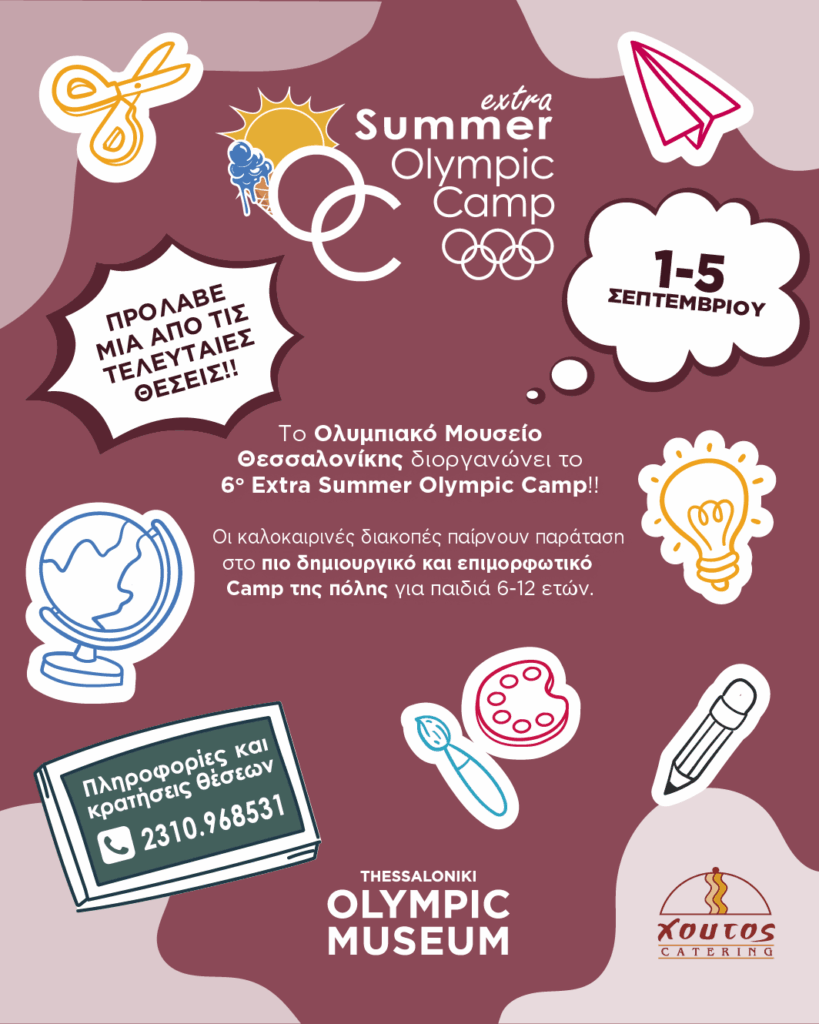 Από: ΟΛΥΜΠΙΑΚΟ ΜΟΥΣΕΙΟ ΘΕΣΣΑΛΟΝΙΚΗΣ – THESSALONIKI OLYMPIC MUSEUM Σάβ 23 Αυγ στις 11:00 π.μ.Logos6ο “EXTRA SUMMER OLYMPIC CAMP”ΕΝΑ ΜΟΝΑΔΙΚΟ ΕΚΠΑΙΔΕΥΤΙΚΟ ΤΑΞΙΔΙ ΓΙΑ ΠΑΙΔΙΑ 6-12 ΕΤΩΝ ΠΡΙΝ ΧΤΥΠΗΣΕΙ ΤΟ ΚΟΥΔΟΥΝΙ ΤΟΥ ΣΧΟΛΕΙΟΥ!!