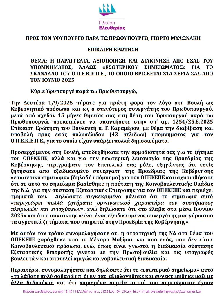 ΔΕΛΤΙΟ ΤΥΠΟΥ21/9/2025ΔΕΛΤΙΟ ΤΥΠΟΥΗ Ζωή Κωνσταντοπούλου συνεχίζει το σφυροκόπημα και φέρνει σήμερα τον Γιώργο Μυλωνάκη στη Βουλή για το σκάνδαλο του ΟΠΕΚΕΠΕΗ Πρόεδρος της Πλεύσης Ελευθερίας αναγκάζει τον Υφυπουργό παρά τω Πρωθυπουργώ Γιώργο Μυλωνάκη να εμφανιστεί σήμερα στη Βουλή και να απαντήσει για το σκάνδαλο του ΟΠΕΚΕΠΕ και την παραβίαση του απορρήτου των Εισαγγελικών Ερευνών.