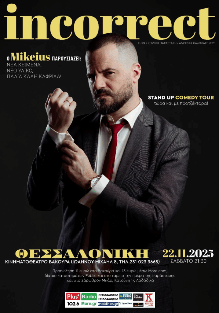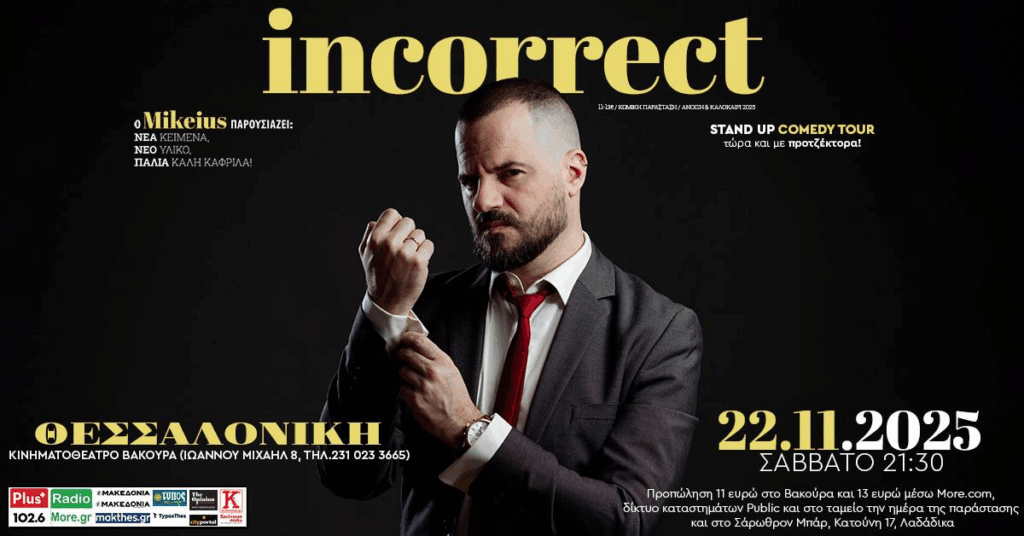 Από: Art On The Road Τρί 18 Νοε στις 4:58 μ.μ. O Mikeius φέρνει την κωμικη παράσταση “Incorrect” στο Cine Βακούρα! Stand Up Comedy ShowMikeius “Incorrect”Νέα κωμική παράσταση, νέα κείμενα, ίδιο πάθος κατά της κορεκτίλας αυτή την φορά στην Θεσσαλονίκη!Πότε; Σάββατο 22 ΝοεμβρίουΠου; Κινηματοθέατρο Βακούρα(Ιωάννου Μιχαήλ 8, τηλ.2310 233665)Ώρα έναρξης: 21.30Εισιτήρια προπωλούνται 11 ευρώ στο ταμείο του Βακούρα και στο Σάρωθρον Café (Κατούνη 17, Λαδάδικα) και 13 ευρώ μέσω του More.com, του δικτύου καταστημάτων Public και στο ταμείο την ημέρα της παράστασης. Τα έχουμε ξαναπεί για τον Mikeius, για την συνεισφορά του στην Youtube κοινότητα αλλά και πόσο αγαπάει…να τον μισεί κόσμος και κοσμάκης, ανά την επικράτεια, είτε παρακολουθεί τα «ΜΠΡΑΦ», είτε τον ακολουθεί σε κάποιο social media του. Όπως και να έχει η προηγούμενη παράσταση του με τίτλο “#CancelMikeius” ακολουθήθηκε από χιλιάδες κόσμο σε όλη την Ελλάδα και την Κύπρο, αγαπήθηκε και έγινε για άλλη μία φορά αφορμή, για να θυμηθούμε πως η σκληρή γλώσσα, καμιά φορά κρύβει τις μεγαλύτερες αλήθειες. Το σωτήριο έτος 2025 λοιπόν, ο master του Politically Incorrect, φέρνει νέα κείμενα, νέες σκέψεις και ιστορίες, έχοντας απέναντι έναν πλανήτη, που μέρα με τη μέρα βρίσκεται απέναντι στις ίδιες της επιλογές του περί πολιτικής ορθότητας. Με κοφτερό λόγο και την χρήση οπτικοακουστικών μέσων, ο Mikeius, βάζει το χιούμορ ως απαραίτητο αλατοπίπερο, απέναντι σε έννοιες, πολιτικές και φόρμες που έχουμε συνηθίσει να φοβόμαστε να ακουμπήσουμε, μήπως χαρακτηριστούμε αρνητικά. Τίποτα δεν ξεφεύγει από την κοφτερή ματιά του Mikeius, τίποτα δεν μένει ασχολίαστο και αν μη τι άλλο θα μας κάνει για άλλη μια φορά να επαναξιολογήσουμε τον όρο «Incorrect».Mikeius “Incorrect”