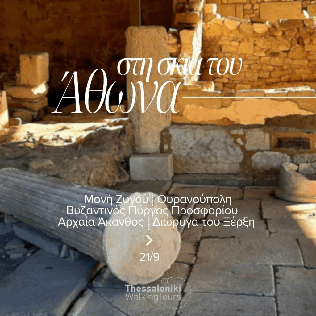 Από: dimitra samsaki Πέμ 4 Σεπ στις 12:26 μ.μ. ThessalonikiWalkingTours – Νέα σεζόν, νέες αφηγήσεις Πρόγραμμα Σεπτεμβρίου 2025Τείχη, γειτονιές γεμάτες ιστορία, άγνωστα σημεία στον αστικό ιστό, μια Μονή στο όριο δύο κόσμων. Για δωδέκατη χρονιά μοιραζόμαστε αφηγήσεις από οικείους και ανοίκειους τόπους και πολιτιστικές διαδρομές εντός και εκτός Θεσσαλονίκης.*** ThessalonikiWalkingTours – Πρόγραμμα Σεπτεμβρίου 2025Τείχη, γειτονιές γεμάτες ιστορία, άγνωστα σημεία στον αστικό ιστό, μιαΜονή στο όριο δύο κόσμων. Για δωδέκατη χρονιά μοιραζόμαστε αφηγήσεις από οικείους και ανοίκειους τόπους και πολιτιστικές διαδρομές εντός και εκτός πόλης. Κυριακή 14 Σεπτεμβρίου – 10:30 π.μ.«Τα Τείχη της Θεσσαλονίκης»Με ξεναγό τον αρχαιολόγο Τάσο Παπαδόπουλο, ακολουθούμε τη γραμμή των δυτικών τειχών της Θεσσαλονίκης σ’ ενα ταξίδι στον χρόνο, το οποίο συνδέει την αρχαιότητα με σήμερα. Μέσα από θραύσματα μνήμης, επιγραφές και μυστικές ιστορίες προσεγγίζουμε το σημαντικό με το φαινομενικά ασήμαντο, το σπουδαίο με το σκοτεινό, τα μεγάλα αφηγήματα με την περιπέτεια των ανθρώπων. Υπέροχες θεάσεις προς το δυτικό κομμάτι της πόλης κι ένα πλήθος των ιστοριών που άφησαν πίσω τους απτά ίχνη συνθέτουν μια εμπειρία με έντονο το στοιχείο της αστικής εξερεύνησηςΣάββατο 20 Σεπτεμβρίου – 17:30 μ.μ.«Ανατολικά του Κέντρου»Η παλιά λεωφόρος Χαμιδιέ, η οδός Αγγελάκη, ο Λευκός Πύργος, μια περιοχή γεμάτηαναμνήσεις, πολλαπλές αναγνώσεις μνημείων μέσα στις οποίες κρύβεται η σύνθετη ταυτότητα της Θεσσαλονίκης. Με οδηγούς τον Τάσο Παπαδόπουλο και την Εύη Καρκίτη περπατάμε δρόμους γνώριμους, στεκόμαστε σε προτομές, παλιά σινεμά και πλατείες, αναζητώντας παράλληλα τα αόρατα εκείνα ίχνη που μας συνδέουν με την πολιτισμική ιστορία της πόλης, μερικές παλιές ιστορίες που γλιστρούν πλέον από τη μνήμη αλλά και σημεία που συνδέονται με αλλοτινές απολαύσεις των Σαλονικιών, μετις αγωνίες τους αλλά και τις πιο μύχιες προσδοκίες τους.Κυριακή 21 Σεπτεμβρίου – 8:30 π.μ.«Στη Σκιά του Άθωνα»Από την Ουρανούπολη έως τη Μονή Ζυγού, ο Τάσος Παπαδόπουλος μας οδηγεί σε μια περιήγηση ανάμεσα σε μνημεία και τοπία που ενώνουν αιώνες βυζαντινής παράδοσης, αρχαίας ιστορίας και λαϊκών θρύλων. Στην πορεία μας συναντάμε τον πύργο του Προσφορίου, τα ίχνη της διώρυγας του Ξέρξη, την αρχαία Άκανθο και το επιβλητικό μοναστηριακό συγκρότημα της Μονής Ζυγού.Στην περιήγησή μας «συμπορευόμαστε»με τον Αθανάσιο τον Αθωνίτη, πάντα κάτω από τη σκιά του