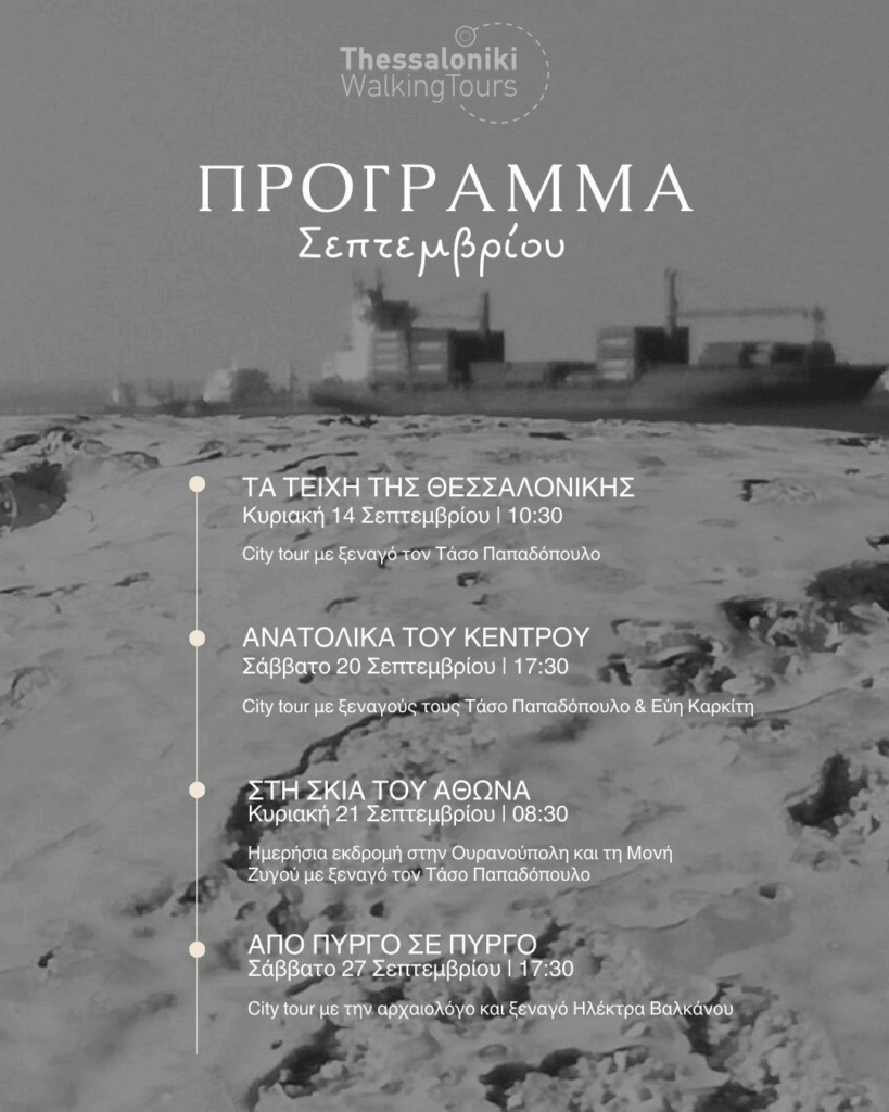 υψιπετούς Άθωνα. Η διαδρομή των 4.400 μέτρων (με επιστροφή) είναι χαμηλής δυσκολίας και προσφέρει μοναδική θέα προς τη Σιθωνία και τη θάλασσα, ενώ ταυτόχρονα μας φέρνει κοντά σε πρόσωπα-σύμβολα και εκτός από τον Αθανάσιο Αθωνίτη «συναντάμε» ακόμη τον Δεινοκράτη, τον Ξέρξη και άλλες ιστορικές μορφέςαπό την αρχαιότητα ως τη νεότερη εποχή.Σημείωση: Απαιτούνται παπούτσια για περπάτημα καθώς η πρόσβαση στη Μονή Ζυγού γίνεται μόνο με τα πόδια.Σάββατο 27 Σεπτεμβρίου – 17:30 μ.μ.«Από Πύργο σε Πύργο»Με την αρχαιολόγο και ξεναγό Ηλέκτρα Βαλκάνου, ξεκινάμε από τον πυργίσκο του δυτικού τείχους (Τοπ Χανέ) και ακολουθούμε τα χνάρια της ιστορίας μέχρι το διασημότερο τοπόσημο της Θεσσαλονίκης. Η διαδρομή μας συνδέει σημεία που ενώνουν το παρελθόν με το παρόν, πλατείες που άλλαξαν πολλά ονόματα, θρυλικά εστιατόρια και ξενοδοχεία από τα μπαλκόνια των οποίων λογοτέχνες θαύμαζαν το ηλιοβασίλεμα. Ένα πλωτό σινεμά που συνδέεται με σκοτεινές σελίδες τις ιστορίας, η παλιά παραλία και το Λιμάνι, όπως αποτυπώθηκαν στο έργο του Θόδωρου Αγγελόπουλου αλλά και στο φαντασιακό των κατοίκων της πόλης, πρόσωπα τα οποίαξεπηδούν από την μπελ επόκ εποχή αλλά και σημεία που συνδέονται με πρόσφατα γεγονότα συνθέτουν μια ξεχωριστή διαδρομή μέσα στο χρόνο. Κρατήσεις & ΠληροφορίεςΟι θέσεις είναι περιορισμένες. Κλείστε έγκαιρα τη συμμετοχή σας και ανακαλύψτε την πόλη και την ιστορία της μέσα από τις διαδρομές του Σεπτεμβρίου .Πληροφορίες & κρατήσεις: info@thessalonikiwalkingtours.com |6944476126
