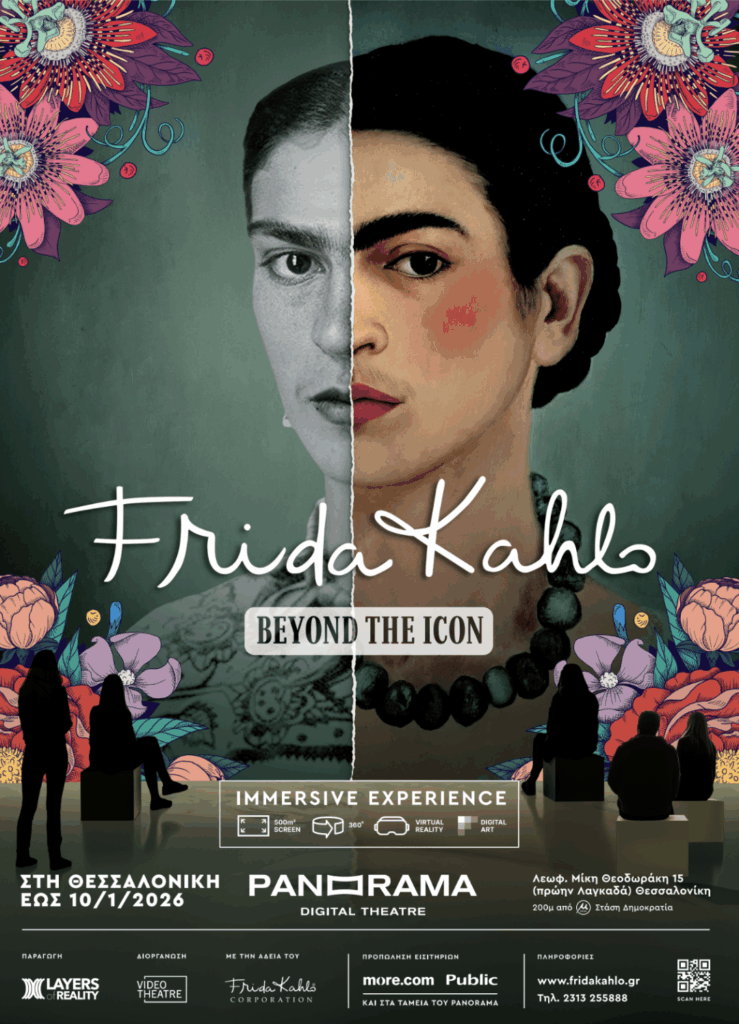 την εικόνα και φτιάξε το δικό σου πορτρέτο εμπνευσμένο από τη Φρίντα. 11. ΕΙΜΑΣΤΕ ΟΛΟΙ ΦΡΙΝΤΑ / WE ARE ALL FRIDA: “Φριντοποίησου” με τη βοήθεια της τεχνητής νοημοσύνης.Ο ΧΩΡΟΣ: Panorama Digital Theatre: (Πανοράμα – με τόνο στο ρα). Μία Στέγη Παραστατικών τεχνών & Ψηφιακών Εκθέσεων, έτοιμη να υποδεχτεί το μέλλον. Ενας χώρος για τονπολιτισμό,τηντέχνηκαιτηνεκπαίδευσηχέριμεχέριμετηντεχνολογία,άνοιξεστοκέντροτηςΘεσσαλονίκης.Τοποθεσία:Panorama Digital Theatre, Λεωφόρος Μίκη Θεοδωράκη 15 (πρώην Λαγκαδά), 54629, Θεσσαλονίκη.Maps link: https://maps.app.goo.gl/YqPq5qJs8SPkzZyF6Προσέλευση:Με το Αυτοκίνητο: – Προς δυτικά στην ΠλατείαΔημοκρατίας(Βαρδάρης)στρίβετε δεξιάστην Λεωφ.ΜίκηΘεοδωράκη(πρώηνΛαγκαδά).150 μέτρα στο αριστερό σας χέρι, δίπλα στο ξενοδοχείο Άνατόλια. – Προς ανατολικά από την Λεωφ. Μίκη Θεοδωράκη (πρώην Λαγκαδά), 150 μέτρα πριν την Πλατεία Δημοκρατίας στο δεξίσαςχέρι.ΕρχόμενοιαπότηΜοναστηρίουήτην26ηςΟκτωβρίου(Δικαστήρια)στρίβετεαριστεράπροςΛεωφ.ΜίκηΘεοδωράκη (πρώην Λαγκαδά) και στα 150 μέτρα στο αριστερό σας χέρι, δίπλα στο ξενοδοχείο Άνατόλια.Διαθέσιμο Parking: Στους γύρω δρόμους μπορείτε να βρείτε νόμιμο δημοτικό parking και ιδιωτικά Parking με πληρωμή ανά ώρα. Με το Μετρό:- Προς ανατολικά, γραμμή προς Νέα Ελβετία, στάση Δημοκρατία, έξοδος προς Λαγκαδά, περπατάτε στο ίδιο πεζοδρόμιο150 μέτρα και φτάνετε.- Προςδυτικά,γραμμήπροςΣιδηροδρομικόΣταθμό,στάσηΔημοκρατία,έξοδοςπροςΛαγκαδά,περπατάτεστοίδιοπεζοδρόμιο 150 μέτρα και φτάνετε.Με το Λεωφορείο: Στάση Πλατεία Δημοκρατίας (ανατολικά και δυτικά στην οδό Μοναστηρίου επί της Πλατείας Δημοκρατίας), 150 μέτρα περπατάτε στη Λεωφόρο Μίκη Θεοδωράκη 15 (πρώην Λαγκαδά).Οι γραμμές λεωφορείων που κάνουν στάση είναι οι: 1Ν, 01Ν, 02Κ, 03Κ, 10, 11, 11Β, 14, 14Ά, 17, 23, 37, 40, 70, 70Ά, 71, 71ΆΕΙΣΙΤΗΡΙΑ: Άποκλειστικά στο More.com και στα ταμεία της έκθεσης. https://www.more.com/gr-el/tickets/museums/frida-kahlo-beyond-the-icon-thessaloniki/Κανονικό: 15 ΕυρώΜειωμένα: Παιδικό (έως 14), Κάρτες ανεργίας/φοιτητικές/πολυτέκνων/65+: 12 Ευρώ. Family 4: 2 παιδιά 2 ενήλικες και 3 παιδιά 1 ενήλικας (50 Ευρώ).Παιδιά κάτω των 4 ετών, εισέρχονται δωρεάν. Διάρκεια επίσκεψης: 50-70 λεπτάΔΙΑΡΚΕΙΑ: Η έκθεση σε περιοδεία έως 12/1/2026.