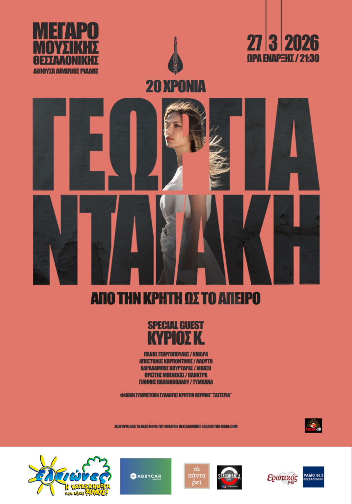 ΓΕΩΡΓΙΑ ΝΤΑΓΑΚΗ«Από την Κρήτη ως το Άπειρο»Παρασκευή 27 Μαρτίου 2026Μέγαρο Μουσικής Θεσσαλονίκης Αίθουσα ΑΙΜΙΛΙΟΣ ΡΙΑΔΗΣ Η Γεωργία Νταγάκη, μία από τις πιο ξεχωριστές και ανήσυχες παρουσίες της σύγχρονης ελληνικής μουσικής σκηνής, παρουσιάζει στο Μέγαρο Μουσικής Θεσσαλονίκης, την παράσταση «Από την Κρήτη ως το Άπειρο», ένα μουσικό ταξίδι που συμπυκνώνει 20 χρόνια δημιουργικής πορείας, αναζήτησης και εξέλιξης.Μουσικός, ερμηνεύτρια και δημιουργός με έντονη διεθνή δραστηριότητα, η Γεωργία Νταγάκη έχει ταυτιστεί όσο λίγοι καλλιτέχνες με την κρητική λύρα, όχι ως σύμβολο παράδοσης, αλλά ως ζωντανό, σύγχρονο όργανο που συνομιλεί με τη σύγχρονη ηλεκτρονική μουσική, το rock, την pop, την techno και τις avant-garde επιρροές.Η καλλιτεχνική της διαδρομή χαρακτηρίζεται από συνεχή κίνηση και τόλμη. Από τις πρώτες της σπουδές στο πιάνο, το τραγούδι και τη θεωρία μουσικής, μέχρι τις σημαντικές συνεργασίες της με κορυφαίους Έλληνες δημιουργούς, αλλά και τη δυναμική της παρουσία στο εξωτερικό, η Γεωργία Νταγάκη διαμορφώνει έναν ήχο απολύτως προσωπικό και αναγνωρίσιμο.Σημαντικοί σταθμοί στην πορεία της περιλαμβάνουν:τη διεθνή κυκλοφορία προσωπικών δίσκων από τις γερμανικές εταιρείες, Network Merdien καθ Monopol Records.τη συμμετοχή της στα World Music Charts της Ευρώπης, με το album «Φόβος / Phobie»τις συνεργασίες και περιοδείες με καλλιτέχνες όπως ο Eric Burdon (The Animals), οι Violent Femmes και ο Goran Bregovic,καθώς και την πρόσφατη επιτυχία του EP «Short Distance», όπου το κομμάτι «Matala» ξεπέρασε το 1.000.000 views σε TikTok και Instagram, επιβεβαιώνοντας τη διαχρονική αλλά και σύγχρονη απήχηση του έργου της.Η παράσταση «Από την Κρήτη ως το Άπειρο» δεν αποτελεί μια αναδρομή με τη στενή έννοια. Είναι μια συμπυκνωμένη αφήγηση ταυτότητας, όπου τραγούδια από όλη τη δισκογραφία της, αγαπημένες συνθέσεις και επιλεγμένες διασκευές συνυπάρχουν οργανικά, με τη λύρα και τη φωνή της να λειτουργούν ως φορείς μνήμης, έντασης και συναισθηματικής αλήθειας. Όπως η ίδια σημειώνει: «Τραγουδώ και παίζω ό,τι με ανατριχιάζει. Αυτή η παράσταση είναι ο τρόπος μου να ενώσω όσα με καθόρισαν και όσα με κινούν σήμερα, χωρίς περιορισμούς.»Σε μια περίοδο καλλιτεχνικής ωριμότητας και εσωτερικής καθαρότητας, η Γεωργία Νταγάκη ανεβαίνει στη σκηνή του Μεγάρου Μουσικής για να παρουσιάσει όχι απλώς ένα πρόγραμμα, αλλά μια ζωντανή εμπειρία, όπου η παράδοση συναντά το παρόν και ανοίγεται προς το μέλλον. ΕΙΣΙΤΗΡΙΑ ΕΔΩ