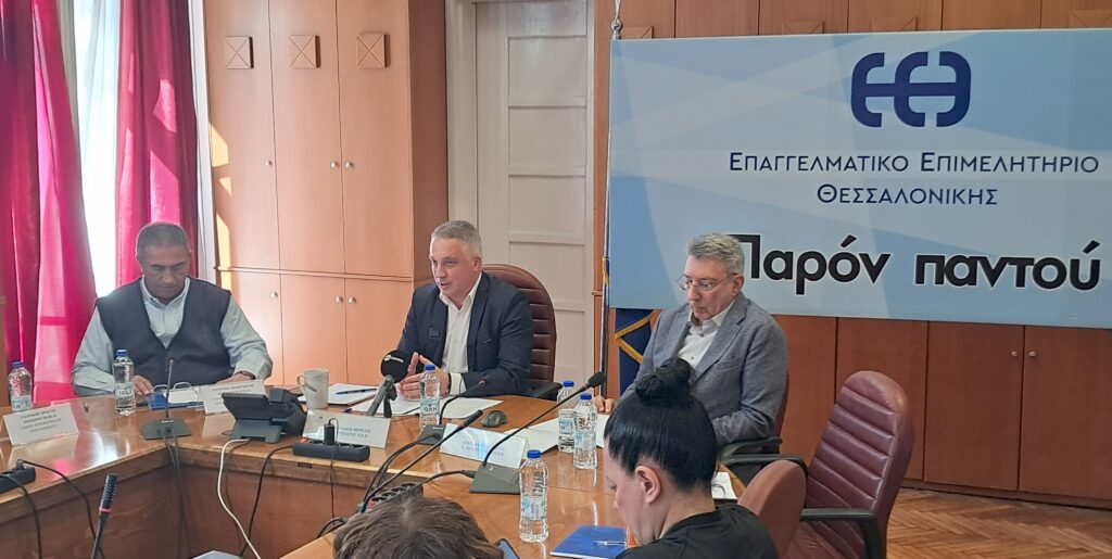 Στη συνέντευξη Τύπου, το Επαγγελματικό Επιμελητήριο Θεσσαλονίκης εκπροσώπησαν, μαζί με τον πρόεδρό του, κ. Κυριάκο Μερελή, ο Α΄ Αντιπρόεδρος, κ. Κώστας Λάσκος, και τα μέλη της Διοικητικής Επιτροπής, κ.κ. Λάζαρος Πίτκας και Δημήτρης Τσαρούχας.