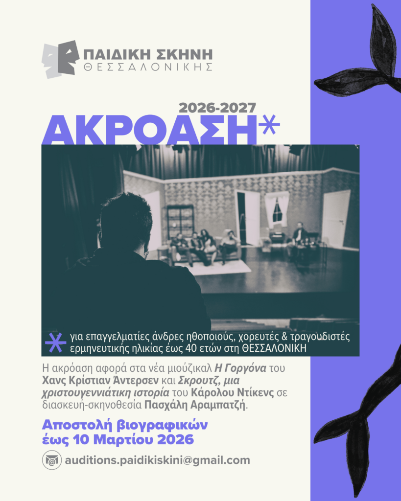 Η Παιδική Σκηνή Θεσσαλονίκης ανακοινώνει ακρόαση για επαγγελματίες άνδρες ηθοποιούς, χορευτές και τραγουδιστές ερμηνευτικής ηλικίας έως σαράντα (40) ετών. Η ακρόαση αφορά στις δύο νέες,μεγάλες παραγωγές της για τη θεατρική σεζόν 2026-2027: τα μιούζικαλ «Η Γοργόνα» του Χανς Κρίστιαν Άντερσεν και «Σκρουτζ, μια χριστουγεννιάτικη ιστορία» του Κάρολου Ντίκενς,που θα παρουσιαστούν στο METROPOLITAN: TheUrbanTheaterστη Θεσσαλονίκησε διασκευή και σκηνοθεσία Πασχάλη Αραμπατζή.