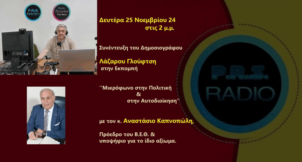 Δευτέρα 25 Νοεμβρίου 2024 στις 2 μ.μ. Συνέντευξη με τον ΑΝΑΣΤΑΣΙΟ ΚΑΠΝΟΠΩΛΗ – Πρόεδρο του Βιοτεχνικού Επιμελητηρίου Θεσσαλονίκης(Β.Ε.Θ) & Υποψήφιο για το ίδιο Αξίωμα, από το Δημοσιογράφο ΛΑΖΑΡΟ ΓΛΟΥΦΤΣΗ, στο PRS radio & την Εκπομπή ”Μικρόφωνο στην Πολιτική & την Αυτοδιοίκηση”