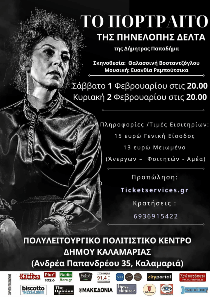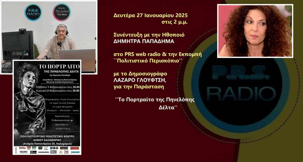Δευτέρα 27 Ιανουαρίου 2025 στις 2 μ.μ. Συνέντευξη με την Ηθοποιό ΔΗΜΗΤΡΑ ΠΑΠΑΔΗΜΑ στο PRS web radio & την Εκπομπή ΄΄Πολιτιστικό Περισκόπιο” με το Δημοσιογράφο ΛΑΖΑΡΟ ΓΛΟΥΦΤΣΗ, για την Παράσταση ”Το Πορτραίτο της Πηνελόπης Δέλτα”