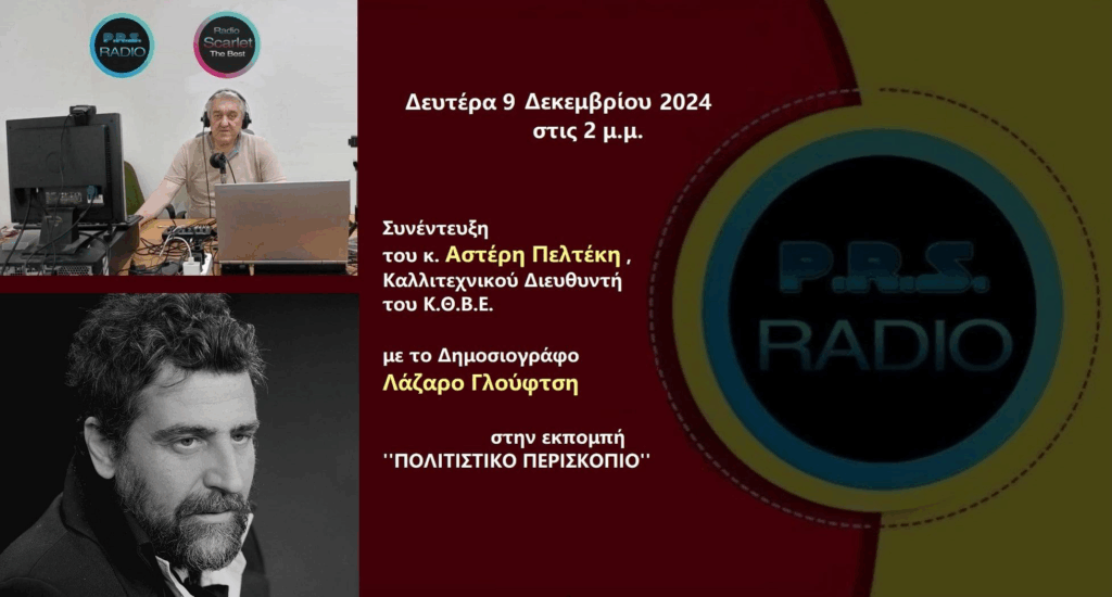 Δευτέρα 9 Δεκεμβρίου 2024 στις 2 μ.μ. Συνέντευξη με τον ΑΣΤΕΡΗ ΠΕΛΤΕΚΗ – Καλλιτεχνικό Διευθυντή του Κρατικού Θεάτρου Βορείου Ελλάδος (Κ.Θ.Β.Ε.), από το Δημοσιογράφο ΛΑΖΑΡΟ ΓΛΟΥΦΤΣΗ, στο PRS radio & την Εκπομπή ”Πολιτιστικό Περισκόπιο”