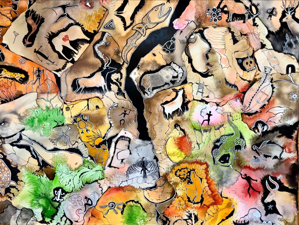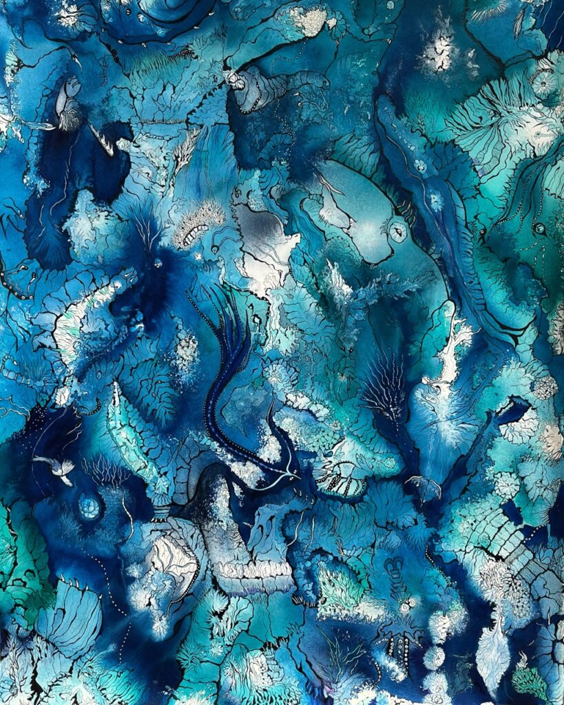 Καθώς η γραφίδα σύρεται απαλά στο χαρτί και το αραιωμένο μελάνι απλώνεται επιδέξια στη λευκή επιφάνεια δουλεμένο σαν υδατογραφία, σχήματα, χρώματα και μοτίβα γεννιούνται διαδοχικά και υπογραμμίζονται απαλά με την επίθετη χρήση λεπτού μαρκαδόρου, πλάθοντας αλληλένδετα σώματα, ατέρμονα νήματα και αειφόρα νοήματα με τον τρόπο μίας περίτεχνης χορογραφίας. Προτείνοντας εγκάρσιες εικόνες ανθεκτικής μικροσκοπικής ζωής με ανακυκλούμενα συστατικά και πρωτογενές οικολογικό μήνυμα. Χαράσσοντας επάλληλους λαβυρίνθους επώασης, ανθοφορίας και ύπαρξης, φθοράς και ανασύστασης.