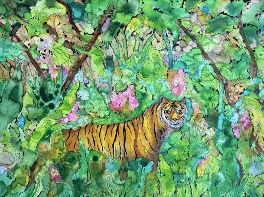 Βυθίζοντας το βλέμμα στις πυκνές ζούγκλες της, όπου άλλοτε φωλιάζει μια τίγρις ή ένα εξωτικό πουλί και όπου άλλοτε κεντρικό θέμα του έργου παραμένουν η ίδια η οργιαστική βλάστηση της φτέρης και οι ζωηρές εκπυρσοκροτήσεις των ανθισμένων λουλουδιών που μετατρέπονται σε αλλεπάλληλα χρώματα και αλληλένδετα μοτίβα, συχνά φέρνω στον νου τον HenriRousseau. Τον μαγικό εκείνο αυτοδίδακτο ζωγράφο που από την πρώτη στιγμή που παρουσίασε τις Ζούγκλες του το 1891, σαγήνευσε ιερά τέρατα της ζωγραφικής και των γραμμάτων όπως ο Vallotton, ο Derain και ο Matisse, ο Delaunay, ο Picasso και ο Apollinaire, με τη φρεσκάδα και τον μοντερνισμό της ναΐφ φαντασίας του, με την ακρίβεια του σχεδίου του, με την παράκαμψη της δυτικής αίσθησης της προοπτικής, με τον αυθεντικό πρωτογονισμό της αγνής ζωγραφικής γλώσσας του. Εισχωρώντας στις συναρπαστικές ζούγκλες της Παρασκευοπούλου που γεννήθηκαν από προσηλωμένη επιθυμία, αληθινή οικολογική ενσυναίσθηση και συστημικό σχεδιαστικό άχθος, ανακαλώ τον ανένταχτο εκείνο ονειροπόλο τελώνη, που κατόρθωσε να αποτυπώσει τα όσα ονειρευόταν και να συστήσει ανέγγιχτους εξωτικούς κόσμους και υπερπόντια λαϊκά παραμύθια άλλων πολιτισμών,μετουσιώνοντας και ανακαλύπτοντας το πιο κοντινό, χωρίς ποτέ του να ταξιδέψει. Περπατώντας σε απάτητα μακρινά δάση μέσα από καρτ-ποστάλ, αποκόμματα εφημερίδων, φωτογραφίες και κοντινούς περιπάτους σε πάρκα και δημοφιλείς παρισινούς θεματικούς κήπους όπως ο JardindesPlantesκαι ο Jardind’Acclimatation.