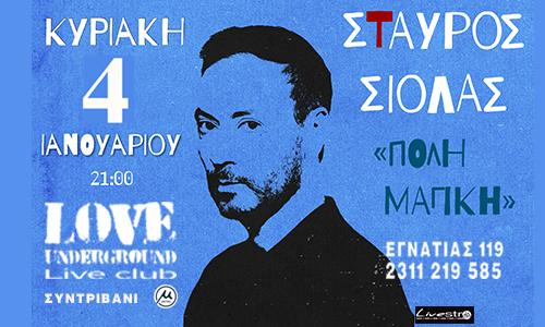- Livestreet Productions Μαριλού Φυντανίδου Τρί 16 Δεκ στις 5:38 μ.μ.Δ Ε Λ Τ Ι Ο Τ Υ Π Ο ΥΣΤΑΥΡΟΣ ΣΙΟΛΑΣ ..Πόλη μαγική..ΚΥΡΙΑΚΗ 4 ΙΑΝΟΥΑΡΙΟΥ 2026LOVE Underground – Live ClubΟ Σταύρος Σιόλας μας προσκαλεί στη μαγική πόλη των τραγουδιών, με τη συγκινητική του φωνή και τα ατμοσφαιρικά του τραγούδια!Ο Σταύρος Σιόλας επιστρέφει για μια και μοναδική εμφάνιση στην πόλη που αγάπησε και αγαπήθηκε μέσα από το φεστιβάλ τραγουδιού Θεσσαλονίκης!Με τη βαλίτσα του γεμάτη τραγούδια όπως της Άρνης το νερό, το Γεροπλάτανο, τα Διόδια,το Κάθε φορά,το Χωρίς εσένα,το Σαν Χουάν και το «Η δικη μας σειρά» από τον τελευταίο του ομότιτλο δίσκο αλλά και με τη χαρακτηριστική του φωνή, ετοιμαζει μια παράσταση που θα μας συγκινήσει και θα μας ξεσηκώσει όπως εκείνος ξέρει.Με άξονες το λυρισμό και την παράδοση, την κατάνυξη και το διονυσιασμό θα μας ταξιδέψει σ ένα ευρύ φάσμα του ελληνικού τραγουδιού μέσα από το προσωπικό του ρεπερτόριο αλλά και τραγούδια σημαντικών Ελλήνων συνθετών και τραγουδοποιών που ξανακαινουργιώνει με τη φωνή του αλλά και με ευρηματικές ενορχηστρώσεις!Την Κυριακη 4 Ιανουαριου στο LOVE Underground στο κέντρο της ΘεσσαλονικηςΠΛΗΡΟΦΟΡΙΕΣLOVE Underground – Live ClubΕγνατίας 119, ΚαμάραΠροσέλευση 20:00 Έναρξη: 21:00Τηλ. κρατήσεων: 2311 219585Πληροφορίες: 6949950530Στάση Μετρό ΠανεπιστήμιοΠροπώληση:13€ & 15€ more.com https :// bit . ly /4 mk 61 FF , PublicΤαμειο:17€ Η αγορά εισιτηρίου δεν εξασφαλίζει θέση καθήμενου.Μετά την ολοκλήρωση της αγοράς, παρακαλούμε καλέστε στο 2311 219 585 για κράτηση θέσεων. ΣΗΜΕΙΑ ΠΩΛΗΣΗΣ ΕΙΣΙΤΗΡΙΩΝ:• ΣΑΡΩΘΡΟΝ (Λαδάδικα) (Κατούνη 17 – 2310.538282)• ΗΛΙΟΤΡΟΠΙΟ (Κέντρο) (Πλ. Ναυαρίνου, Τηλ. 2310.278515)• ΔΙΩΡΟΦΟΝ (Καλαμαριά) (Κερασούντος 81, Τηλ. 2310.453998)• ΛΥΚΙΣΚΟΣ (Άνω Ηλιουπολη) (Συνταγματάρχου Δαβάκη 65 , Τηλ. 2311.241863)