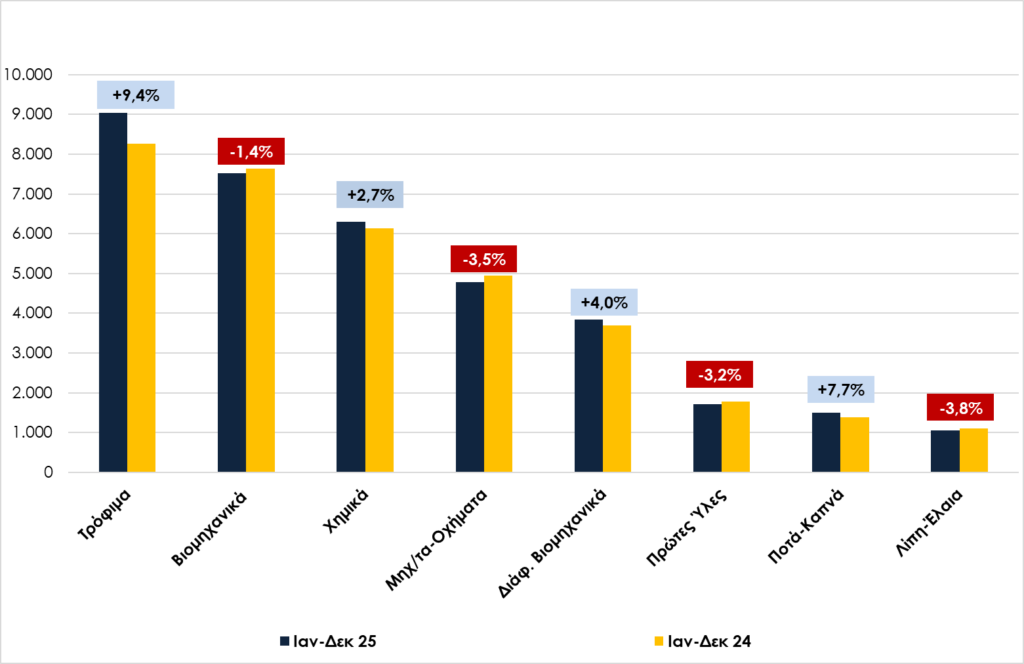 Tania Ziaka | SEVE · Δευ 9 Φεβ στις 9:54 π.μ. ΔΕΛΤΙΟ ΤΥΠΟΥ Θεσσαλονίκη, 09.02.2026 Οριακή άνοδος των εξαγωγών τον Δεκέμβριο – Μείωση στο σύνολο του 2025, αλλά ανθεκτικότητα χωρίς τα πετρελαιοειδήΔήλωση Προέδρου ΣΕΒΕ«Το 2025 ολοκληρώθηκε σε ένα ιδιαίτερα απαιτητικό διεθνές περιβάλλον, με τις γεωπολιτικές εντάσεις, το υψηλό κόστος χρηματοδότησης και τις διαταραχές στις εμπορικές ροές να συνεχίζουν να επηρεάζουν την εξαγωγική δραστηριότητα. Παρά τη μείωση των συνολικών εξαγωγών σε ετήσια βάση, η εικόνα χωρίς τα πετρελαιοειδή αναδεικνύει την ανθεκτικότητα και τη δυναμική της παραγωγικής βάσης, με αύξηση 2,0% και ισχυρές επιδόσεις σε τρόφιμα, χημικά και βιομηχανικά προϊόντα. Την ίδια στιγμή, η σημαντική άνοδος των εισαγωγών –ιδίως χωρίς πετρελαιοειδή– υπογραμμίζει αφενός την ενίσχυση της εγχώριας ζήτησης και αφετέρου την ανάγκη επενδύσεων που θα περιορίσουν τη διαρθρωτική εξάρτηση από το εξωτερικό. Η περαιτέρω ενίσχυση της εξωστρέφειας, η διαφοροποίηση αγορών και η στήριξη των επιχειρήσεων σε κλάδους υψηλής προστιθέμενης αξίας παραμένουν κρίσιμες προϋποθέσεις για μια πιο ισορροπημένη και βιώσιμη αναπτυξιακή πορεία.» Ανάλυση Εμπορευματικών Συναλλαγών 2025 Οριακή αύξηση κατέγραψαν οι εξαγωγές τον Δεκέμβριο του 2025, σύμφωνα με τα προσωρινά στοιχεία που ανακοίνωσε στις 06.02.2026, η ΕΛΣΤΑΤ και επεξεργάστηκε το ΙΕΕΣ του ΣΕΒΕ. Συγκεκριμένα, σύμφωνα με τον Πίνακα 1, η συνολική αξία των εξαγωγών αγαθών ανήλθε σε €4.109,2 εκατ. τον Δεκέμβριο του 2025, έναντι €4.079,0 εκατ. τον Δεκέμβριο του 2024, σημειώνοντας αύξηση κατά €30,2 εκατ. ή 0,7%. Αύξηση καταγράφηκε και στις εισαγωγές, οι οποίες ανήλθαν σε €7.661,7 εκατ. τον Δεκέμβριο του 2025, από €7.548,1 εκατ. τον αντίστοιχο μήνα του 2024, παρουσιάζοντας άνοδο κατά €113,6 εκατ. ή 1,5%. Ως αποτέλεσμα, το έλλειμμα του εμπορικού ισοζυγίου διευρύνθηκε, διαμορφούμενο σε €-3.552,5 εκατ. τον Δεκέμβριο του 2025, έναντι €-3.469,1 εκατ. τον Δεκέμβριο του 2024, σημειώνοντας επιδείνωση κατά €83,4 εκατ. ή 2,4%. Πίνακας 1. Εξωτερικό εμπόριο αγαθών, Δεκέμβριος 2024/2025(ποσά σε εκατ. ευρώ)Δεκ 25*Δεκ 24*Διαφορά 25/24ΕΤ 25/24Εξαγωγές4.109,24.079,030,20,7%Εισαγωγές7.661,77.548,1113,61,5%Εμπορικό Ισοζύγιο-3.552,5-3.469,1-83,42,4%Πηγή: ΕΛΣΤΑΤ, Επεξεργασία: ΙΕΕΣ-ΣΕΒΕ, ΕΤ: Ετήσια Τάση, *προσωρινά στοιχεία ΕΛΣΤΑΤ Όταν εξαιρούνται τα πετρελαιοειδή, παρατηρείται οριακή αύξηση των εξαγωγών και σημαντική άνοδος των εισαγωγών, σύμφωνα με τα στοιχεία του Πίνακα 2. Οι εξαγωγές χωρίς πετρελαιοειδή ανήλθαν σε €3.066,2 εκατ. τον Δεκέμβριο του 2025, έναντι €3.054,3 εκατ. τον αντίστοιχο μήνα του 2024, σημειώνοντας αύξηση κατά €11,9 εκατ. ή 0,4%. Παράλληλα, οι εισαγωγές χωρίς πετρελαιοειδή διαμορφώθηκαν σε €6.391,9 εκατ. τον Δεκέμβριο του 2025, από €5.877,0 εκατ. τον Δεκέμβριο του 2024, καταγράφοντας αύξηση κατά €514,9 εκατ. ή 8,8%. Ως εκ τούτου, το έλλειμμα του εμπορικού ισοζυγίου χωρίς πετρελαιοειδή διευρύνθηκε, διαμορφούμενο σε €-3.325,7 εκατ. τον Δεκέμβριο του 2025, έναντι €-2.822,7 εκατ. τον αντίστοιχο μήνα του προηγούμενου έτους, παρουσιάζοντας επιδείνωση κατά €503,0 εκατ. ή 17,8%. Πίνακας 2. Εξωτερικό εμπόριο αγαθών, χωρίς πετρελαιοειδή, Δεκέμβριος 2024/2025(ποσά σε εκατ. ευρώ)Δεκ 25*Δεκ 24*Διαφορά 25/24ΕΤ 25/24Εξαγωγές3.066,23.054,311,90,4%Εισαγωγές6.391,95.877,0514,98,8%Εμπορικό Ισοζύγιο-3.325,7-2.822,7-503,017,8%Πηγή: ΕΛΣΤΑΤ, Επεξεργασία: ΙΕΕΣ-ΣΕΒΕ, ΕΤ: Ετήσια Τάση, *προσωρινά στοιχεία ΕΛΣΤΑΤ Σε επίπεδο δωδεκαμήνου, για την περίοδο Ιανουαρίου–Δεκεμβρίου 2025, οι εξαγωγές αγαθών ανήλθαν σε €48.600,2 εκατ., καταγράφοντας μ