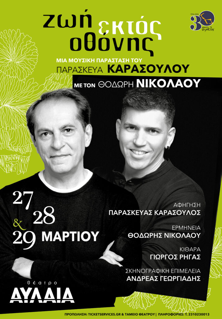 ΕΛΕΝΗ ΤΣΟΛΑΚΗ · Δευ 2 Μαρ στις 2:37 μ.μ. ΖΩΗ ΕΚΤΟΣ ΟΘΟΝΗΣστη Θεσσαλονίκη27, 28 & 29 ΜαρτίουΘέατρο ΑυλαίαΜια μουσική παράστασημε αφηγητή τον Παρασκευά Καρασούλοερμηνευτή τον Θοδωρή Νικολάουκαι τον κιθαρίστα Γιώργο Ρήγα«-Τρία πράγματα δεν πρέπει να λείπουν από το σπίτι σας,έλεγε ο παππούς Ηλίας : το ψωμί, η αγάπη και το τραγούδι.Το ψωμί θα σας κρατάει γερούς, η αγάπη ενωμένους και το τραγούδι ζωντανούς. Και μας παρέδωσε αυτό το προζύμι που φτιάχνουμε το ψωμί μας ως σήμερα.»Από το κείμενο της παράστασης Ζωή εκτός Οθόνης Η μουσική παράσταση, Εκτός Οθόνης, που επιμελήθηκε ο Παρασκευάς Καρασούλος παρουσιάζεται στη Θεσσαλονίκη στο θέατρο Αυλαία στις 27, 28 και 29 Μαρτίου, με τον σπουδαίο ερμηνευτή Θοδωρή Νικολάου και τον κιθαρίστα Γιώργο Ρήγα.Η παράσταση αφηγείται την οδύσσεια μιας οικογένειας, όπως την έζησαν τα πολλά και διαφορετικά μέλη της, διασχίζοντας τον 20ο αιώνα έως σήμερα.Τα τραγούδια που κράτησαν ζωντανές τις μνήμες τους και σημάδεψαν τη διαδρομή τους πάνω από έναν αιώνα: από την παράδοση, το λαϊκό μας τραγούδι, το σύγχρονο έντεχνο έως τις πιο πρόσφατες αναφορές.Η αγάπη και το χιούμορ που τους βοήθησαν να προχωρούν μαζί. Και το προζύμι της οικογένειας, που σαν γλώσσα – ρίζα τους έδωσε νόημα και προορισμό πορείας.Από την αυγή του 20ου αιώνα ως τις μέρες μας, η ζωή όπως μας έφτασε εδώ, μέσα από τραγούδια, εικόνες και τις διάσπαρτες αφηγήσεις των ηρώων μιας μοναδικής εποχής, της εποχής μας…Μια σκηνική πρόταση που ενώνει εικόνα, λόγο και τραγούδι, ένα θεατρικό-μουσικό αναλόγιο με κέντρο την προσωπική αποτύπωση της ιστορικής μνήμης.· Το κείμενο της παράστασης υπογράφει ο στιχουργός – συγγραφέας Παρασκευάς Καρασούλος, που το αφηγείται ο ίδιος και επί σκηνής με τον Θοδωρή Νικολάου· Τις εικόνες που συνοδεύουν τις αφηγήσεις επιμελήθηκε ο ζωγράφος Ανδρέας Γεωργιάδης, ενώ τη σκηνοθετική επιμέλεια έχει ο Σταύρος Ράγιας · Τα τραγούδια μετέγραψε και επιμελήθηκε για κιθάρα, ο σολίστας κιθαρίστας Γιώργος Ρήγας· Τραγουδά ο εξαιρετικός ερμηνευτής Θοδωρής Νικολάου TAYTOTHTA ΠΑΡΑΣΤΑΣΗΣΚείμενο – καλλιτεχνική επιμέλεια: Παρασκευάς ΚαρασούλοςΑφήγηση: Παρασκευάς Καρασούλος – Θοδωρής ΝικολάουΕρμηνεία: Θοδωρής ΝικολάουΜεταγραφή – εκτέλεση τραγουδιών για κιθάρα: Γιώργος ΡήγαςΣκηνοθεσία: Σταύρος ΡάγιαςΣκηνογραφική επιμέλεια – βίντεο: Ανδρέας ΓεωργιάδηςΠαραγωγή : ΜΙΚΡΗ ΑΡΚΤΟΣΕπικοινωνία: Μαρία Τσολάκη——Θέατρο ΑΥΛΑΙΑ, Τσιμισκή 136 ΘεσσαλονίκηΗμέρες παραστάσεων: Παρασκευή 27, Σάββατο 28 & Κυριακή 29 Μαρτίου 2026Ώρα έναρξης: Παρασκευή & Σάββατο 21.00, Κυριακή 20.00Τιμή εισιτηρίου: 20 ευρώΠροπώληση:https://www.ticketservices.gr/event/theatro-avlaia-zoi-ektos-othonis/?lang=elκαι στο Ταμείο του θεάτρουΠληροφορίες: 231 023 0013 ΖΩΗ ΕΚΤΟΣ ΟΘΟΝΗΣ στηΘεσσαλονίκη 27, 28 & 29 Μαρτίου Θέατρο Αυλαία Μια μουσική παράσταση με αφηγητή τον Παρασκευά Καρασούλο ερμηνευτή τον Θοδωρή Νικολάου και τον κιθαρίστα Γιώργο Ρήγα