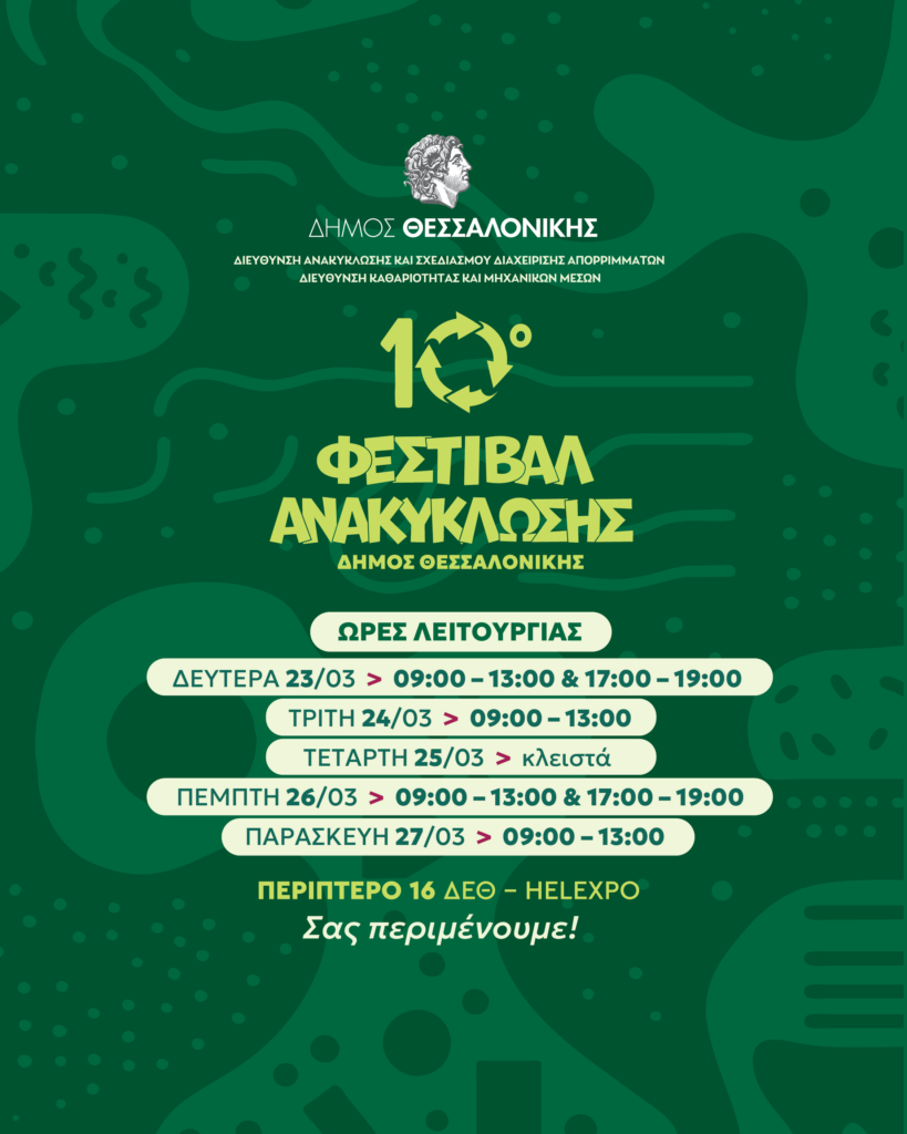 Butterfly Communication · Τρί 24 Μαρ στις 4:58 μ.μ. ΔΕΛΤΙΟ ΤΥΠΟΥ Θεσσαλονίκη, 24 Μαρτίου 2026 Ημερίδα για τη διαχείριση απορριμμάτων και τις καλές πρακτικές ανακύκλωσης στο 10ο Φεστιβάλ Ανακύκλωσης Δήμου Θεσσαλονίκης Ημερίδα με θέμα «Σχέδιο Διαχείρισης Απορριμμάτων – Καλές Πρακτικές Ανακύκλωσης» διοργανώνει ο Δήμος Θεσσαλονίκης, στο πλαίσιο του 10ου Φεστιβάλ Ανακύκλωσης, την Πέμπτη 26 Μαρτίου 2026, στις 17:00, στο Stage του Περιπτέρου 16, στη ΔΕΘ – HELEXPO.Στην ημερίδα θα παρουσιαστούν σύγχρονες προσεγγίσεις και πρακτικές για τη διαχείριση των απορριμμάτων, με έμφαση στην ανακύκλωση, την κυκλική οικονομία και τις δυνατότητες βελτίωσης των συστημάτων διαχείρισης σε τοπικό και περιφερειακό επίπεδο.Χαιρετισμούς θα απευθύνουν ο Δήμαρχος Θεσσαλονίκης Στέλιος Αγγελούδης, ο Αντιπεριφερειάρχης Μητροπολιτικής Ενότητας Θεσσαλονίκης Κωνσταντίνος Γιουτίκας, η Διευθύνουσα Σύμβουλος του ΕΟΑΝ Δρ. Αλεξάνδρα Σοφία Τόγια και ο Πρόεδρος του Δ.Σ. ΦΟΔΣΑ Κεντρικής Μακεδονίας Μιχάλης Γεράνης.Στις εισηγήσεις της ημερίδας συμμετέχουν ο Αντιδήμαρχος Καθαριότητας, Ανακύκλωσης και Κλιματικής Προστασίας του Δήμου Θεσσαλονίκης Λάζαρος Ζαχαριάδης, ο Υπεύθυνος Τμήματος ΟΤΑ της ΕΕΑΑ Δημήτριος Παπασωτηρίου, ο Διευθύνων Σύμβουλος της COMBATT Δρ. Διονύσης Μπουντουβάς, ο Διευθύνων Σύμβουλος της ΑΝΑΚΕΜ Α.Ε. Ηλίας Δημητριάδης, καθώς και ο Δασολόγος – Περιβαλλοντολόγος και Διευθυντής Τμήματος Urban της BIOSOLIDS Α.Ε. Ευάγγελος Παπαϊωάννου.Κατά τη διάρκεια της εκδήλωσης θα τιμηθούν εκπρόσωποι φορέων για τη συμβολή τους στην προώθηση της ανακύκλωσης.Η ημερίδα εντάσσεται στο ευρύτερο πρόγραμμα του Φεστιβάλ Ανακύκλωσης, το οποίο περιλαμβάνει δράσεις ενημέρωσης και εκπαίδευσης για μαθητές και πολίτες, με στόχο την ενίσχυση της περιβαλλοντικής συνείδησης και την προώθηση της ανακύκλωσης.__________________________________Παρακαλούμε για τη δημοσίευσή του