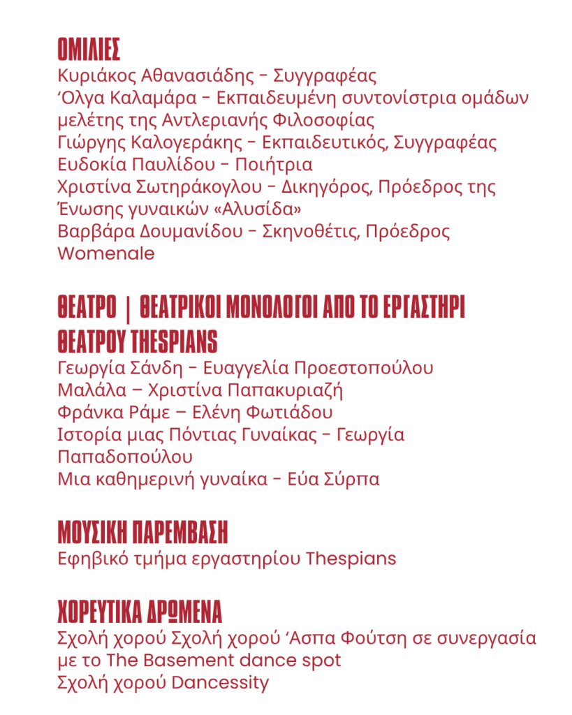 – Ομιλίες: Κυριάκος Αθανασιάδης συγγραφέας, ‘Ολγα Καλαμάρα Εκπαιδευμένη συντονίστρια ομάδων μελέτης της Αντλεριανής Φιλοσοφίας, Γιώργης Καλογεράκης Συγγραφέας Εκπαιδευτικός, Ευδοκία Παυλίδου Ποιήτρια, Χριστίνα Σωτηράκογλου Δικηγόρος, Πρόεδρος της Ένωσης γυναικών «Αλυσίδα»,Βαρβάρα Δουμανίδου Σκηνοθέτις – Πρόεδρος Womenale