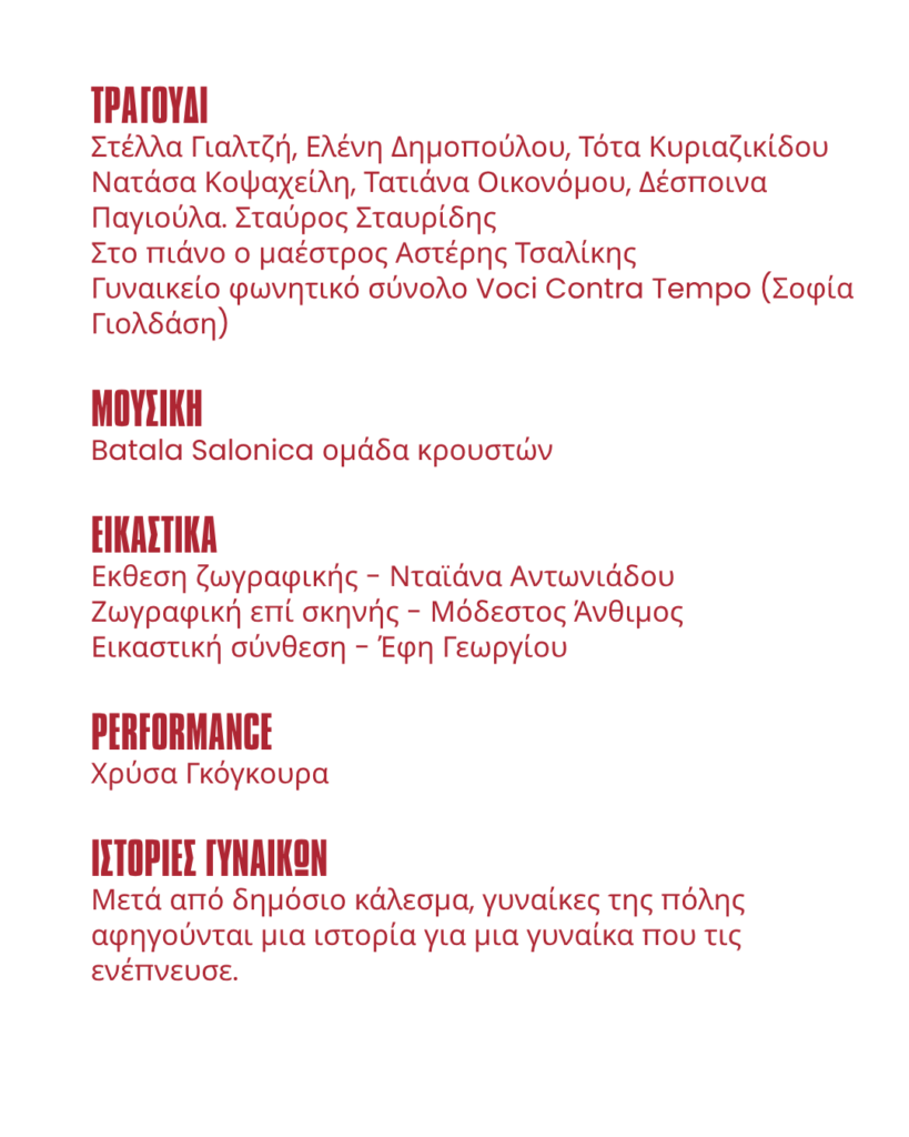 – Ιστορίες γυναικών (μετά από δημόσιο κάλεσμα, γυναίκες της πόλης αφηγούνται μια ιστορία για μια γυναίκα που τις ενέπνευσε.)