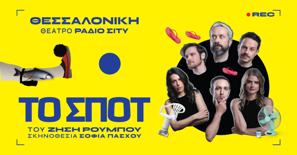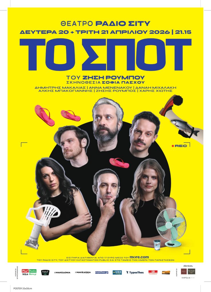 Art On The Road · Πέμ 26 Μαρ στις 5:21 μ.μ. “ΤΟ ΣΠΟΤ” του Ζήση ΡούμπουΣκηνοθεσία: Σοφία ΠάσχουΗ μεγάλη επιτυχία του φετινού χειμώνα έρχεται στην Θεσσαλονίκη! Πόλη: ΘεσσαλονίκηΘέατρο: Ράδιο Σίτυ (Β.Όλγας 11 και Παρασκευοπούλου 9, τηλ.2313 25450)Ημερομηνία: Δευτέρα 20 και Τρίτη 21 Απριλίου 2026Ώρα έναρξης: 21.15Εισιτήρια διατίθενται από 17 ευρώ μέσω του More.com, του δικτύου καταστημάτων Public, του Ράδιο Σίτυ και στο ταμείο την ημέρα της παράστασης.Το νέο έργο του Ζήση Ρούμπου «ΤΟ ΣΠΟΤ», σε σκηνοθεσία της Σοφίας Πάσχου, έπειτα από μία επιτυχημένη σειρά παραστάσεων στην Αθήνα, ξεκινά την περιοδεία του σε όλη την Ελλάδα, με πρώτο σταθμό την Θεσσαλονίκη!Μια σουρεαλιστική, ξεκαρδιστική κωμωδία γύρω από το γύρισμα ενός διαφημιστικού σποτ για την Ελλάδα, μέσα σε ένα θέατρο όπου όλοι – ακόμα και το κοινό – παίζουν ρόλο!Ο Δημήτρης Μακαλιάς, η Άννα Μενενάκου, η Δανάη Μιχαλάκη, ο Άλκης Μπακογιάννης, ο Ζήσης Ρούμπος και ο Χάρης Χιώτης δίνουν πνοή σε μια ευφυή σάτιρα για την εικόνα της σύγχρονης Ελλάδας.ΥΠΟΘΕΣΗΤο Υπουργείο Πολιτισμού έχει δώσει ένα μεγάλο budget για να γυριστεί ένα διαφημιστικό σποτάκι για την Ελλάδα. Ένα καλλιτεχνικό δημιούργημα που οραματίστηκε ο γνωστός σκηνοθέτης Ιωνάθαν Τσέτρης, ο βραβευμένος με Όσκαρ για την ταινία του «ΜΠΟΥΖΙ». Αντί να χρησιμοποιήσει φυσικά τοπία και μνημεία, αληθινούς χώρους και εικόνες, ο σκηνοθέτης αποφάσισε να καταφύγει στην avant garde αισθητική του και να το γυρίσει όλο μέσα σε ένα θέατρο με πάρα πολλούς κομπάρσους. Δηλαδή, το κοινό της παράστασης!Πρωταγωνιστές του σποτ: η καταξιωμένη τραγωδός Βεατρίκη, η πρωτοεμφανιζόμενη και γλυκύτατη Ρένα και σε ρόλο έκπληξη ο Στράτος Ασλανίδης, που αφήνει για λίγο τις βραδινές πίστες και τα γεμάτα στάδια και βρέχει τα πόδια του και στην υποκριτική.Τρεις ηθοποιοί, ένας καταξιωμένος πειραματικός σκηνοθέτης, ο υπέρ-αγχωτικός βοηθός του και ο υπεύθυνος του θεάτρου, θα προσπαθήσουν να γυρίσουν ένα διαφημιστικό σποτ για την Ελλάδα. Θα καταφέρουν να ανακαλύψουν την ουσία της χώρας και να την αποτυπώσουν στην κάμερα; Θα μείνουν εντός μπάτζετ; Θα συνεργαστούν ή θα μαλλιοτραβηχτούν;«ΤΟ ΣΠΟΤ» είναι η παράσταση στην οποία ο κάθε εμπλεκόμενος καλείται να μεγαλουργήσει. Ακόμα και το κοινό.Για την Ελλάδα!ΣυντελεστέςΣκηνοθεσία: Σοφία ΠάσχουΕπιμέλεια οπτικοακουστικού υλικού: Σωτήρης Τσαφούλιας, Claudio BolivarΣκηνικά-Κοστούμια: Ζενεβιέβ ΑθανασοπούλουΦωτισμοί: Στέλλα ΚάλτσουΜουσική: Νίκος ΓαλενιανόςΒοηθός σκηνοθέτη: Βασίλης ΣταματάκηςΣχεδιασμός αφίσας, γραφιστική επιμέλεια :Χρυσούλα Κοροβέση (Mavra Gidia)Social Media: Social WaveΦωτογράφος: Μάριος ΘεολόγηςMakeup & Hair Styling: Ελένη ΠαϊρακταρίδουΠΑΙΖΟΥΝ (αλφαβητικά):Δημήτρης Μακαλιάς, Άννα Μενενάκου, Δανάη Μιχαλάκη, Άλκης Μπακογιάννης, Ζήσης Ρούμπος, Χάρης ΧιώτηςFacebook event εδώSite προπώλησης εδώTeaser παράστασης εδώΓια περαιτέρω πληροφορίες – διευκρινίσεις: artontheroad.grΣημαντική σημείωση:Για ανέργους, άτομα άνω των 65 ετών και ΑμεΑ, διατίθενται εκπτωτικά εισιτήρια στα 15€. Για να τα εξασφαλίσετε, παρακαλούμε να πραγματοποιήσετε τηλεφωνική κράτηση στο ταμείο του Ράδιο Σίτυ (τηλ. 2313 254500). Την ημέρα της παράστασης είναι απαραίτητη η επίδειξη του αντίστοιχου δικαιολογητικού/εγγράφου ταυτοποίησης. — Art On The Road Productions