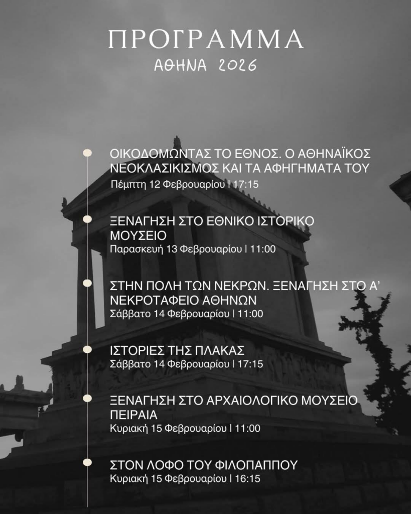 - Με τον Τάσο ΠαπαδόπουλοΣάββατο 14 Φεβρουαρίου 2026 | 11:00«Στην πόλη των νεκρών»Ξενάγηση στο Α΄ Νεκροταφείο ΑθηνώνΤο Α΄ Νεκροταφείο Αθηνών αποτελεί τη μεγαλύτερη ανοιχτή γλυπτοθήκη της Ελλάδας. Στον χώρο αυτό, όπου η ιστορία συναντά την τέχνη, έχουν ενταφιαστεί σημαντικές προσωπικότητες της νεότερης ελληνικής ιστορίας, ενώ εργάστηκαν μερικοί από τους κορυφαίους Έλληνες γλύπτες του 19ου και 20ού αιώνα. Με διάθεση εξερεύνησης και αναστοχασμού, περιηγούμαστε στην αθηναϊκή πόλη των νεκρών και συνομιλούμε μαζί τους μέσα από τα επιτύμβια μνημεία.Με τον Τάσο ΠαπαδόπουλοΙστορίες της Πλάκας | 17:15Η Πλάκα αποτελεί ένα μοναδικό ιστορικό παλίμψηστο. Αρχαία ερείπια, βυζαντινές εκκλησίες,οθωμανικά τζαμιά και νεοκλασικές οικίες συνθέτουν ένα ετερόκλητο αρχιτεκτονικό σύνολο που λειτουργεί ως χωροταξικό πρελούδιο προς τον Ιερό Βράχο. Περιηγούμαστε στην περιοχή και ανακαλύπτουμε την ιστορία και τη μικροϊστορία της. Ο Παπαδιαμάντης, ο Μπάιρον και ο Έλγιν, ο Τζισδαράκης και ο Ανδρόνικος είναι μερικά μόνο από τα πρόσωπα που συναντάμε στον περίπατό μας.Με τον Τάσο ΠαπαδόπουλοΚυριακή 15 Φεβρουαρίου 2026 | 11:00Ξενάγηση στο Αρχαιολογικό Μουσείο ΠειραιάΤο Αρχαιολογικό Μουσείο του Πειραιά αποτελεί ένα από τα λιγότερο γνωστά αλλά ιδιαίτερα σημαντικά μουσεία της Αττικής. Διαθέτει εξαιρετική συλλογή αρχαιοτήτων, όπως επιτύμβια γλυπτά, σπάνια αγγεία και τέσσερα μοναδικά χάλκινα αγάλματα που προκαλούν συγκίνηση και δέος.Με τον Τάσο ΠαπαδόπουλοΣτον λόφο του Φιλοπάππου | 16:15Η ζωή του Γάιου Ιουλίου Αντιόχου Φιλοπάππου αποτελεί μία από τις πιο συναρπαστικές ιστορίες του αρχαίου κόσμου. Απόγονος της βασιλικής οικογένειας του ελληνιστικού βασιλείου της Κομμαγηνής και εγγονός του τελευταίου βασιλιά της, συνδέθηκε στενά με την