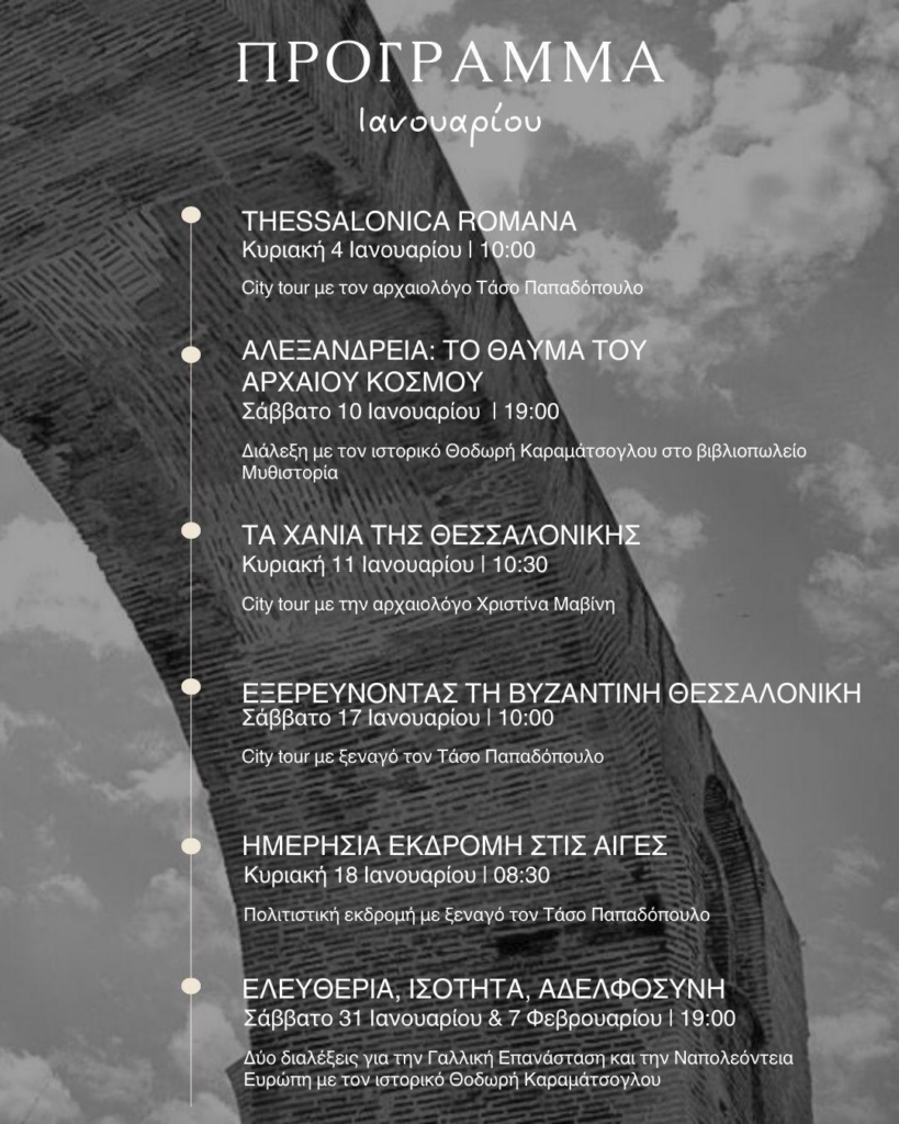 - μεσοπολεμικά ξενοδοχεία, φωτίζοντας τις πρώτες κοσμοπολίτικες ζώνες διαμονής της πόλης.Σάββατο 17 ΙανουαρίουΕξερευνώντας τη βυζαντινή Θεσσαλονίκη: Αγία Σοφία – Αχειροποίητος – Άγιος ΔημήτριοςΜε τον Τάσο Παπαδόπουλο — Ώρα 10:00 π.μ.Ένας περίπατος στην καρδιά της βυζαντινής Θεσσαλονίκης, εκεί όπου η πόλη περιγράφεται ως περιφανεστάτη και θεοφρούρητος. Μέσα από τρεις εμβληματικές εκκλησίες, γνωρίζουμε την τοπογραφία της μεσαιωνικής πόλης, τα ψηφιδωτά, τις τοιχογραφίες και την παλαιοχριστιανική γλυπτική. Πέρα από τα μνημεία, αναζητούμε τους ανθρώπους, τις ιδέες και τις αντιλήψεις που διαμόρφωσαν το πνεύμα της βυζαντινής μεγαλούπολης.Κυριακή 18 ΙανουαρίουΗμερήσια Εκδρομή στις ΑιγέςΜε τον Τάσο Παπαδόπουλο — Ώρα 08:30Μια ολοήμερη προσέγγιση στον χώρο των Αιγών, τη βασιλική μητρόπολη των Μακεδόνων. Η ξενάγηση περιλαμβάνει το μουσείο των βασιλικών τάφων, το πολυκεντρικό μουσείο και το ανάκτορο, φωτίζοντας την ιστορία, τα ευρήματα και τους πρωταγωνιστές ενός τόπου που άλλαξε τον τρόπο με τον οποίο αντιλαμβανόμαστε τη μακεδονική ιστορία.Παρασκευή 31 Ιανουαρίου & 7 Φεβρουαρίου«Ελευθερία, Ισότητα, Αδελφοσύνη» Η Γαλλική Επανάσταση και η Ναπολεόντεια ΕυρώπηΔύο διαλέξεις με τον ιστορικό Θοδωρή Καραμάτσογλου — Ώρα 19:00 Βιβλιοπωλείο ΜυθιστορίαΗ Γαλλική Επανάσταση ως σημείο καμπής για τη γέννηση της σύγχρονης Ευρώπης. Τα αίτια, οι κοινωνικές ζυμώσεις, η εποχή του Τρόμου και η πτώση της μοναρχίας οδηγούν στην ανάδειξη του Ναπολέοντα και στη ριζική μεταμόρφωση της ευρωπαϊκής πολιτικής σκέψης.Πληροφορίες & Κρατήσειςinfo@thessalonikiwalkingtours.com | 6944476126