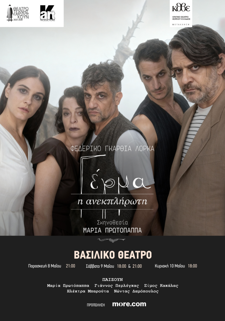 Παρασκευή 8, Σάββατο 9 & Κυριακή 10 Μαΐου Η παράσταση «Γέρμα (η ανεκπλήρωτη)» του Φεδερίκο Γκαρθία Λόρκα, σε σκηνοθεσία Μαρίας Πρωτόπαππα, ολοκληρώνοντας με επιτυχία μια σεζόν στο ιστορικό Υπόγειο του Θεάτρου Τέχνης Καρόλου Κουν, έρχεται στο Βασιλικό Θέατρο για λίγες παραστάσεις.