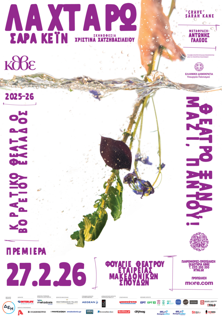 ΦΟΥΑΓΙΕ ΘΕΑΤΡΟΥ ΕΤΑΙΡΕΙΑΣ ΜΑΚΕΔΟΝΙΚΩΝ ΣΠΟΥΔΩΝ Πρεμιέρα: Παρασκευή 27|02|2026, στις 21.00«Τρία καλοκαίρια πριν είχα πένθος. Δεν πέθανε κανένας αλλά έχασα τη μητέρα μου». Λαχταρώ της Sarah Kane, η νέα παραγωγή του ΚΘΒΕ, μια εκ βαθέων εξερεύνηση του ανθρώπινου ψυχισμού αντιμέτωπου με οριακές καταστάσεις, έρχεται στο Φουαγιέ του Θέατρου Εταιρείας Μακεδονικών Σπουδών σε σκηνοθεσία και δραματουργική επεξεργασία Χριστίνας Χατζηβασιλείου. Το έργο, που παρουσιάζεται για πρώτη φορά σε σκηνή του ΚΘΒΕ, θα κάνει πρεμιέρα την Παρασκευή 27 Φεβρουαρίου 2026, στις 21.00.