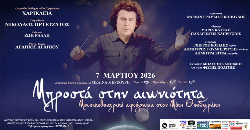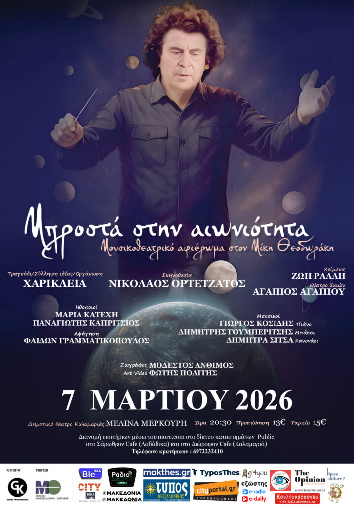 Art On The Road Τρί 17 Φεβ στις 5:42 μ.μ. “Μπροστά στην αιωνιότητα”Μουσικοθεατρικό αφιέρωμα στην ζωή, το έργο και τη φιλοσοφική σκέψη του Μίκη ΘεοδωράκηΔημοτικό Θέατρο Καλαμαριάς «Μελίνα Μερκούρη»(Μεταμορφώσεως 7, τηλ.2310 458591)Σάββατο 7 Μαρτίου 2026 | Ώρα έναρξης: 20.30