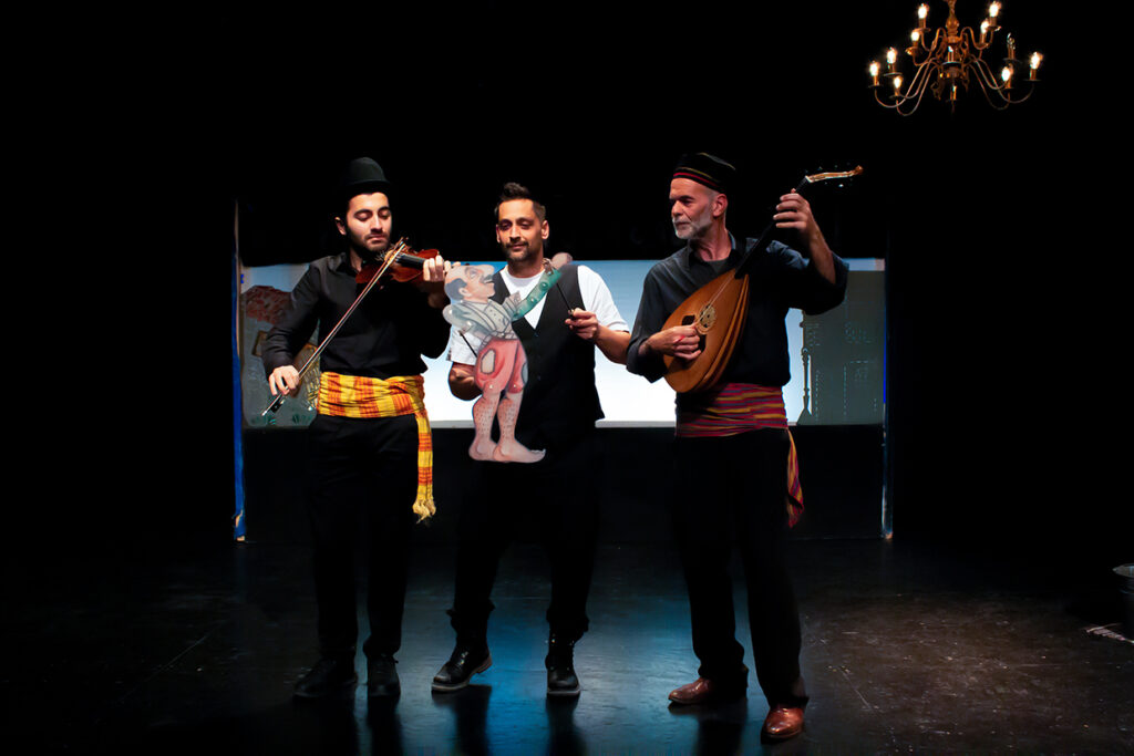 • Στην παράσταση συμμετέχει ζωντανά ο καραγκιοζοπαίχτης Κώστας Σπυρόπουλος. Βοηθοί στο μπερντέ, οι μαθητές της Ακαδημίας Θεάτρου Σκιών «Θανάσης Σπυρόπουλος».