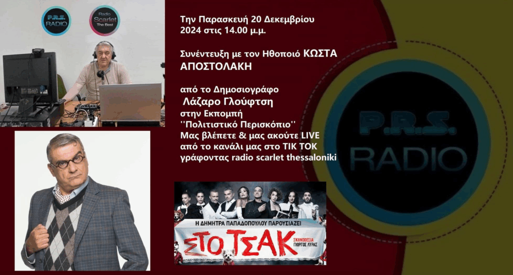 ΜΗ ΤΟ ΧΑΣΕΤΕ !!!!!!!!!!!!!!!!!!!!!!! Αύριο Παρασκευή 20 Δεκεμβρίου στις 2 μ.μ. Συνέντευξη με τον Ηθοποιό ΚΩΣΤΑ ΑΠΟΣΤΟΛΑΚΗ !!!!! & Στις 2.30 μ.μ. με την Ηθοποιό ΒΑΣΩ ΛΑΣΚΑΡΑΚΗ !!!!!!!!!!!!!!!! στην εκπομπή μου ”Πολιτιστικό Περισκόπιο”