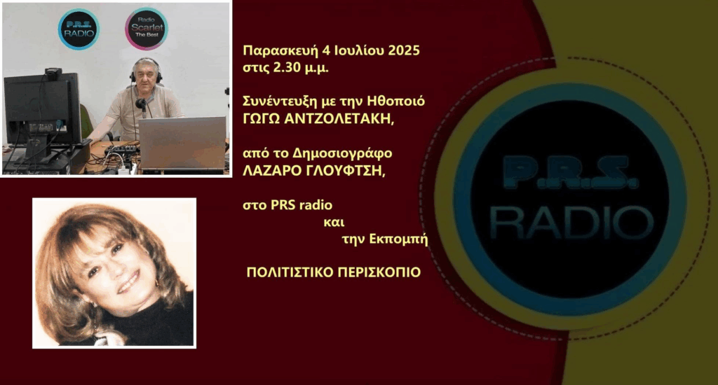 Παρασκευή 4 Ιουλίου 2025 στις 2.30 μ.μ. Συνέντευξη με την Ηθοποιό ΓΩΓΩ ΑΤΖΟΛΕΤΑΚΗ, από το Δημοσιογράφο ΛΑΖΑΡΟ ΓΛΟΥΦΤΣΗ, στο PRS radio & την Εκπομπή ΠΟΛΙΤΙΣΤΙΚΟ ΠΕΡΙΣΚΟΠΙΟ.