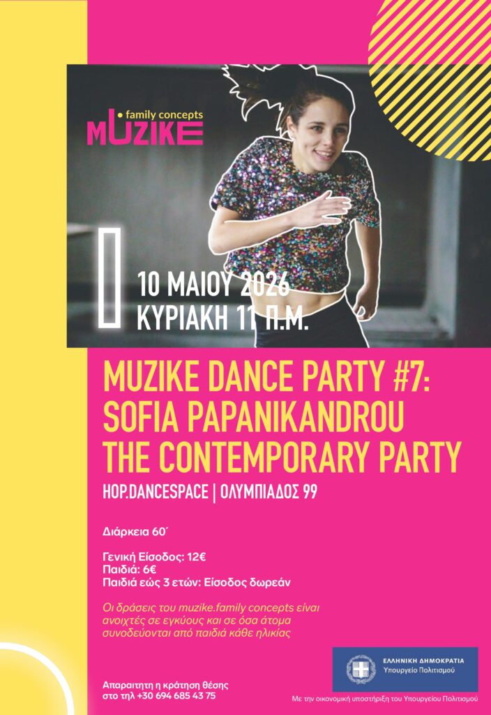 Μαρία Τότσκα· Πέμ 23 Απρ στις 12:22 π.μ. Μετά από μια σειρά επιτυχημένων και αγαπημένων Muzike Dance Parties, το τελευταίο party της χρονιάς έρχεται με επίκεντρο τον σύγχρονο χορό και καλεσμένη τη χορεύτρια και χορογράφο Σοφία Παπανικάνδρου. ΜUZIKE DANCE PARTY #7: Sofia Papanikandrou – The Contemporary Party