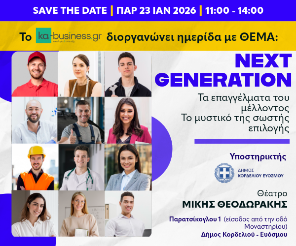 Ka-business.gr: Αναλυτικό Πρόγραμμα – NEXT GENERATION: Τα Επαγγέλματα του μέλλοντος – Το μυστικό της Σωστής ΕπιλογήςΤο ka-business.gr διοργανώνει την 1η Ημερίδα με Θέμα:«NEXT GENERATION: Τα Επαγγέλματα του Μέλλοντος – Το μυστικό της σωστής επιλογής»ΒΑΣΙΚΟΣ ΥΠΟΣΤΗΡΙΚΤΗΣ: ΔΗΜΟΣ ΚΟΡΔΕΛΙΟΥ – ΕΥΟΣΜΟΥΒΑΣΙΚΟΙ ΧΟΡΗΓΟΙ: ΒΕΘ – ΡΟΥΛΑ ΡΟΥΒΑ – FORBES GLOBAL PROPERTIES – UNIVERSITY of YORKΤην Παρασκευή 23 Ιανουαρίου 2026, 11:00 – 14:00Στο πολυλειτουργικό Κέντρο – Θέατρο «Μίκης Θεοδωράκης»Οι εργασίες θα μεταδίδονται ζωντανά μέσω live streaming στο ka business.gr.Συντονιστείτε …10 ομιλητές από τον χώρο της εκπαίδευσης, της επαγγελματικής σταδιοδρομίας και της αγοράς θα δώσουν απαντήσεις στα ερωτήματα: Πώς επιλέγουμε τα επαγγέλματα του μέλλοντος ?Ποια είναι τα επαγγέλματα του μέλλοντος?Ποιες είναι οι νέες προκλήσεις των επαγγελμάτων και ο ανταγωνισμός?Το μυστικό της σωστής επιλογής?Πώς η τεχνητή νοημοσύνη επηρεάζει την εκπαίδευση και την επιλογή επαγγελμλατων?… γιατί η επόμενη ημέρα ανήκει στα νέα παιδιά. Η σωστή επιλογή θα δημιουργήσει τις βάσεις για μία χώρα της καινοτομίας και της ανάπτυξης.Αναλυτικό πρόγραμμα11:00 ΠΡΟΣΕΛΕΥΣΗ 11:15 …ΠερισσότεραΑκολουθήστε μας στα social media