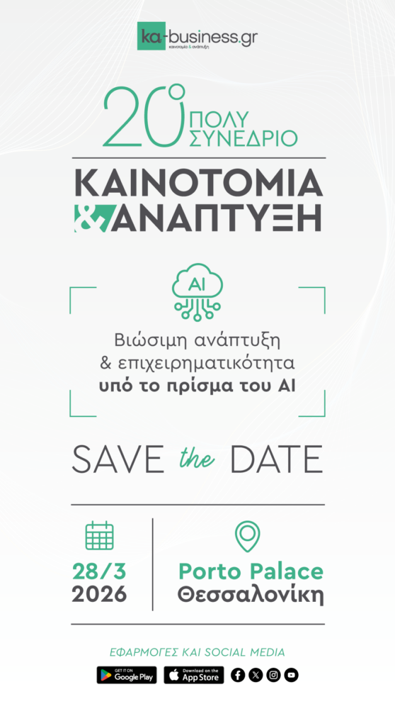 SAVE THE DATE: 20ο πολυσυνέδριο ΚΑΙΝΟΤΟΜΙΑ & ΑΝΑΠΤΥΞΗ του ka-business.gr – Σάββατο 28 Μαρτίου POTRTO PALACE ΘεσσαλονίκηTo ka-business.gr συνεχίζει να παρουσιάζει…ΠερισσότεραSAVE THE DATE: Women of Influence – Οι Γυναίκες του Σήμερα την Κυριακή 8 Μαρτίου 2026, στις 13:00 στο ξενοδοχείο ΟΝΟΜΑΜε αφορμή την Παγκόσμια Ημέρα της Γυναίκας, το ΟΝΟΜΑ Hotel αναλαμβάνει την πρωτοβουλία και διοργανώνει την εκδήλωση «Women of Influence – Οι Γυναίκες του Σήμερα», την Κυριακή 8 Μαρτίου 2026, στις 13:00, στον πρώτο όροφο του ξενοδοχείου, αίθουσα Library (Μοναστηρίου 24, Θεσσαλονίκη). Η εκδήλωση έχει ως στόχο να αναδείξει γυναίκες με ουσιαστική διαδρομή, φωνή και επιρροή, μέσα από προσωπικά βιώματα και success stories που αποτυπώνουν την πραγματικότητα της γυναίκας σήμερα. Στο πάνελ θα συμμετέχουν γυναίκες από τον χώρο της επιχειρηματικότητας, του πολιτισμού, των τεχνών, της επιστήμης και της κοινωνικής δράσης, ενώ τη συζήτηση θα συντονίσει η δημοσιογράφος , ανταποκρίτρια  στο star channel  και δημιουργός του ka-business.gr Ραλλιώ Λεπίδου. Συγκεκριμένα, τις ιστορίες και τις εμπειρίες τους θα μοιραστούν: • η δημοσιογράφος Σύνθια Σάπικα, • η επιχειρηματίας…ΠερισσότεραΑκολουθήστε μας στα social media