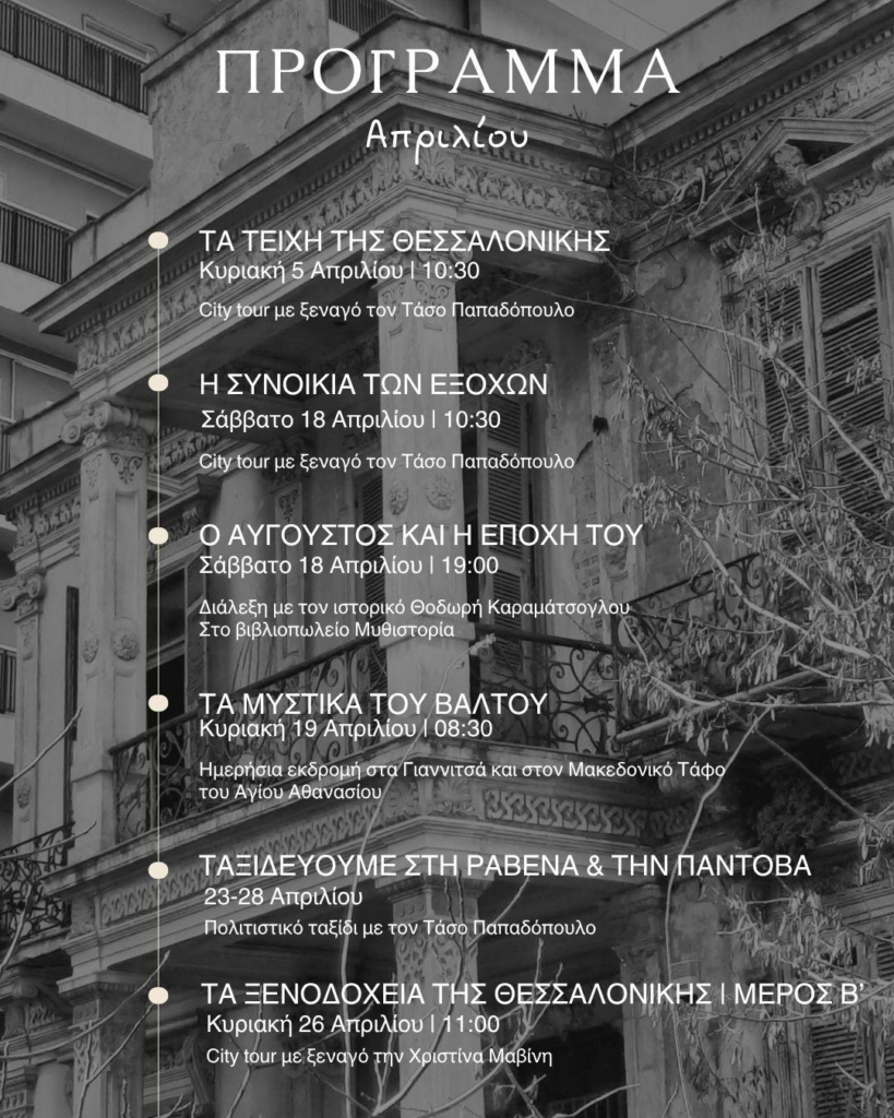 - Ένα πολυδιάστατο πρόγραμμα πολιτιστικών δράσεων παρουσιάζεται τον Απρίλιο, περιλαμβάνοντας θεματικές ξεναγήσεις στην πόλη, ιστορικές διαλέξεις, ημερήσιες εκδρομές και ταξίδι στο εξωτερικό. Οι δράσεις αναδεικνύουν τη μακραίωνη ιστορία της Θεσσαλονίκης και της ευρύτερης περιοχής, φωτίζοντας τόσο τα μεγάλα ιστορικά γεγονότα όσο και τις λιγότερο γνωστές πτυχές τους.
